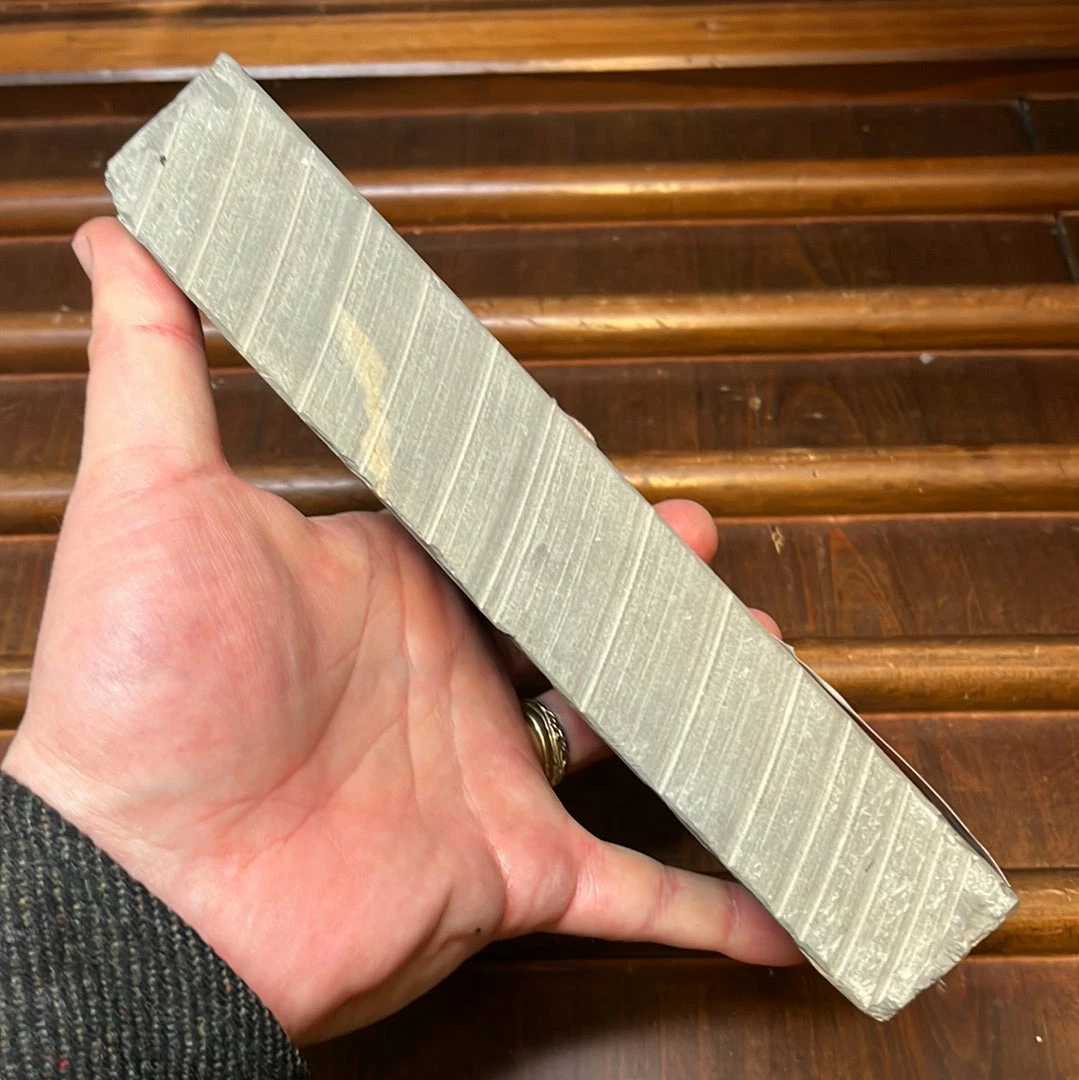 Old stock stone from theย Tomae strata of the Ohira mine. A good sized full rectangular shaped stone with no flaws, flat and level. Hard but not scratchy, once a little mud is up it cuts very fast, a sub mirror finish with more water and pressure, can be graded a bit finer with less pressure on worked mud. Some small patches of su can be seen in the light colored band.ย