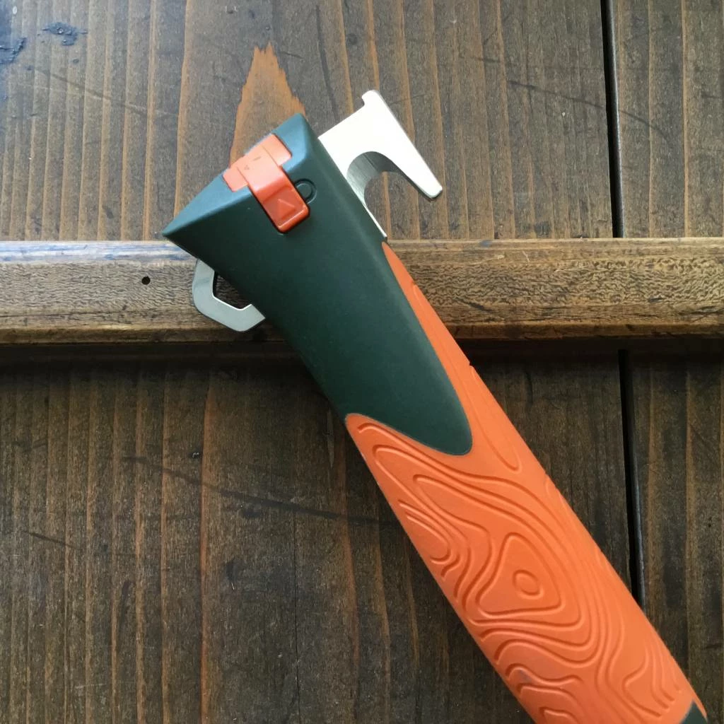 A robust and functional knife for adventuring into the outdoors. Suited for survival and hunting tasks, the handle includes a fire starter, cutting hook for rope and a whistle that functions in all weathers.
