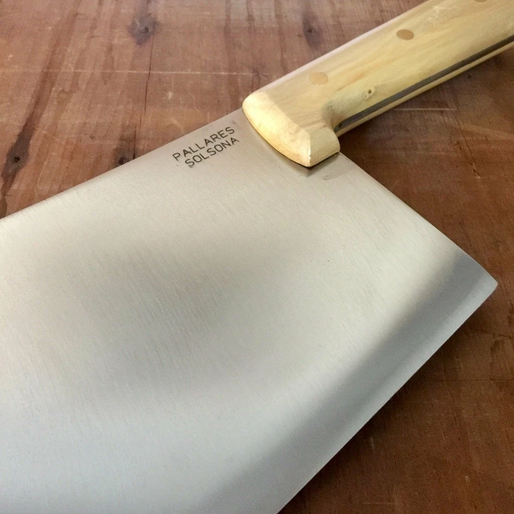 Pallares 10″ Butcher Cleaver. Full tang carbon steel blade with riveted boxwood handle. Handmade in Solsona, Spain. No Dishwasher. Dry after use to avoid rust.