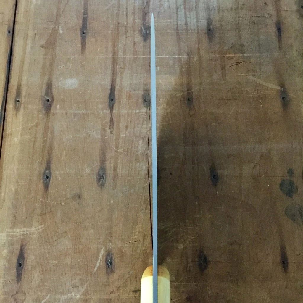 Carbon steel will develop a patina with use, especially with acidic foods. Special attention is needed to keep from rusting. Do not leave wet. Hand wash & dry, no dishwasher. Hardwood-end grain or softwood long grain cutting boards are preferred; avoid bamboo and plastic cutting boards. Rust can be removed with a light abrasive.