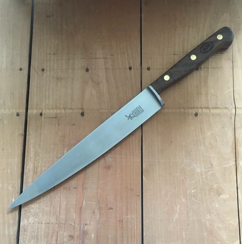 The ‘1922’ mid-pointed 8.75″ flexible carbon slicer blade with walnut handle.