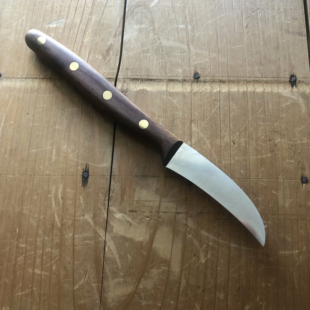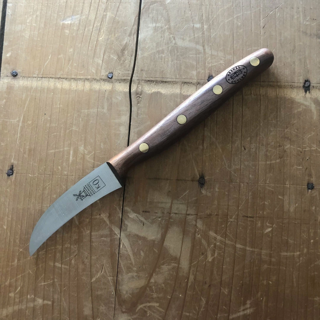 The K0 bird’s beak knife has a curved blade; a classic paring knife, perfect for peeling or any small prep work. The Windmühlenmesser ‘K’ series knives are inspired by classic Japanese double bevel designs. They have thin geometry and are easy to sharpen, making them a shop favorite. The blades feature a ‘blue’ glaze, a shiny final polish from natural stone powder. The ergonomic handles are hand polished and shaped.
