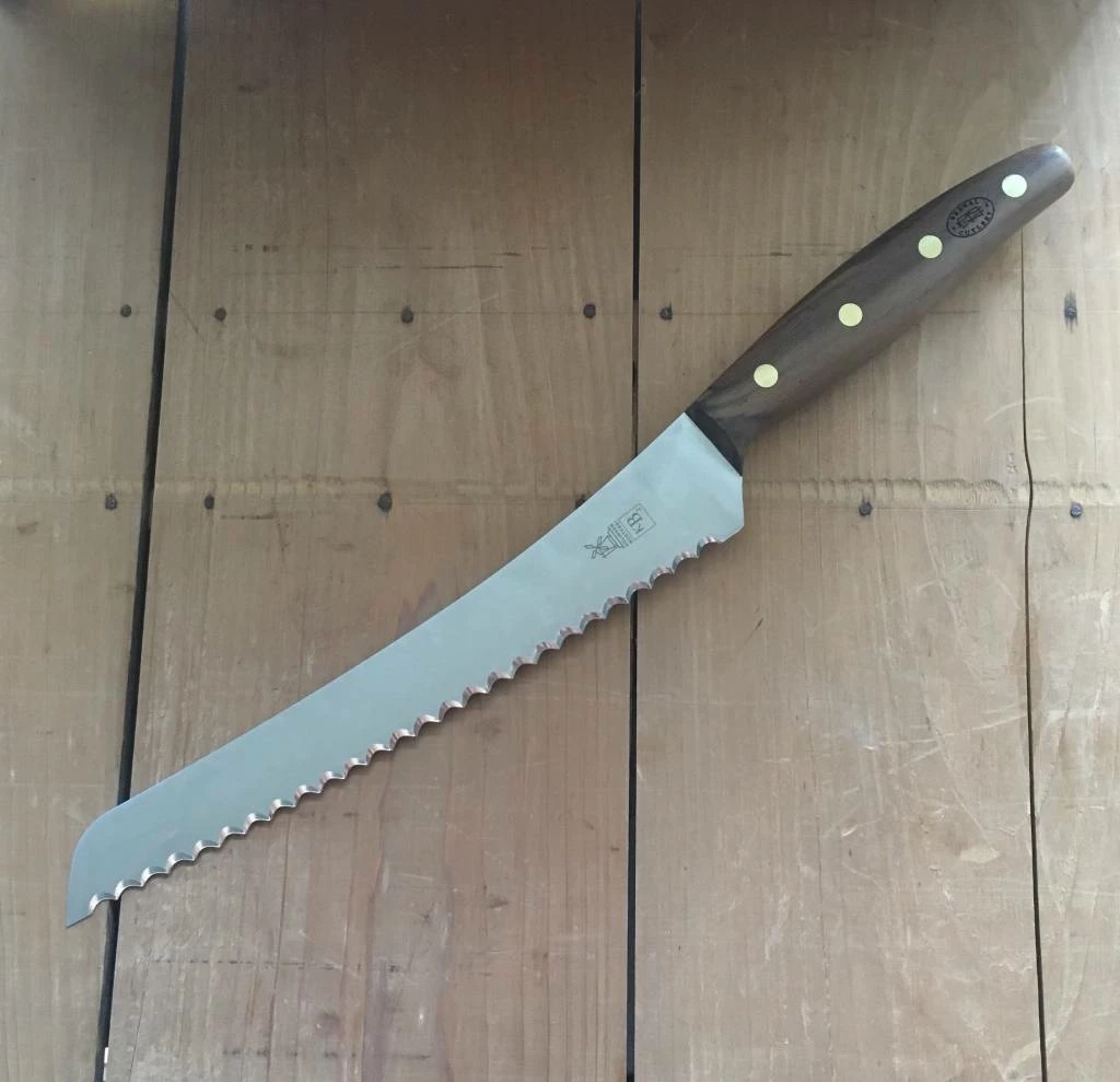 This bread knife has a serrated edge on both sides; a great ambidextrous option with long edge life! The Windmühlenmesser ‘K’ series knives are inspired by classic Japanese double bevel designs. They have thin geometry and are easy to sharpen, making them a shop favorite. The blades feature a ‘blue’ glaze, a shiny final polish from natural stone powder. The ergonomic handles are hand polished and shaped.