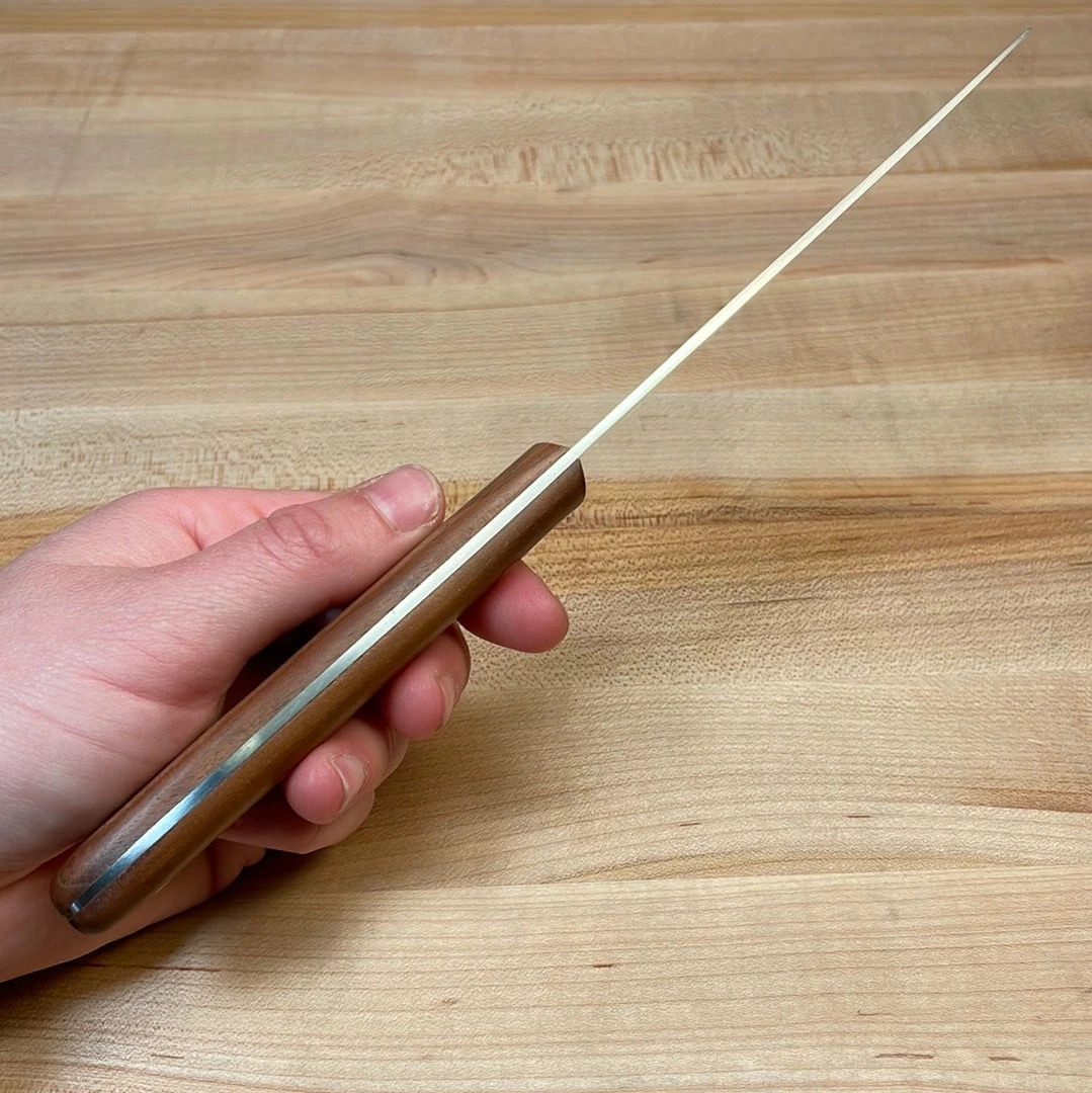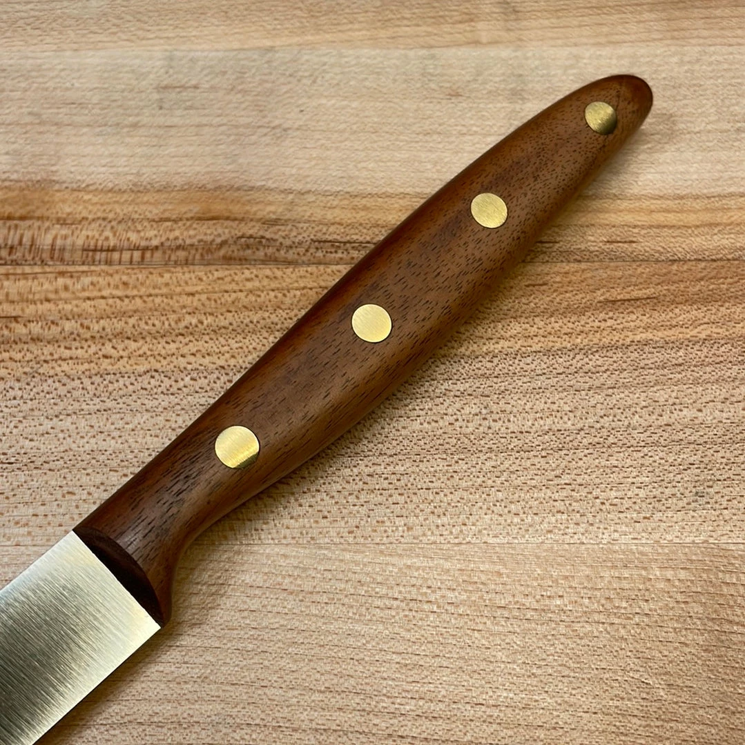 The slim steak knife is pointed with micro serrations. It’s made of a stainless steel blade with 0.7% carbon and hardened to 60 HRC, blue glazed with hand-shaped and walnut wood handle.