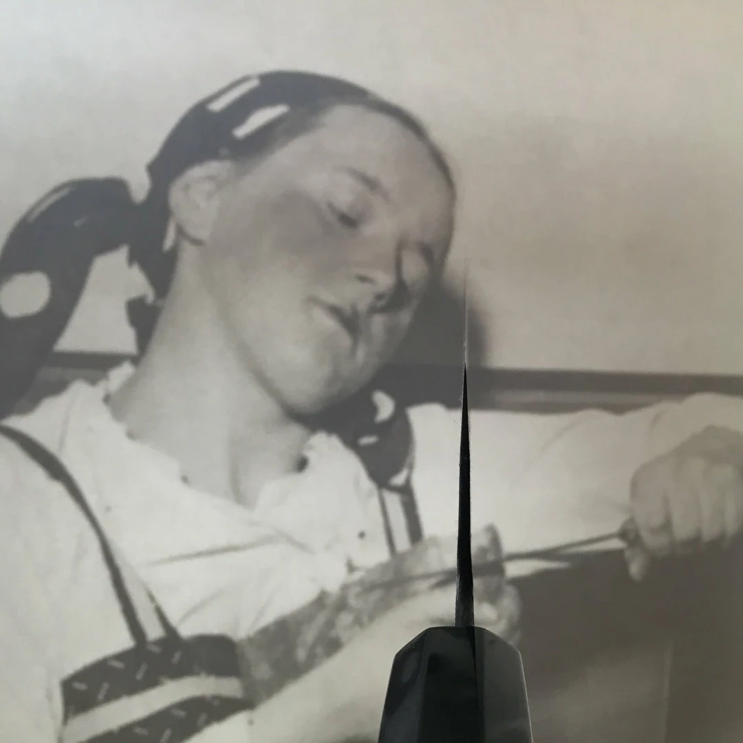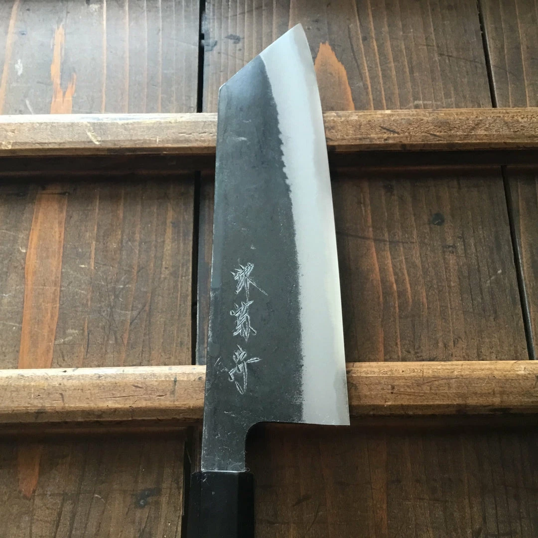 Hand forged iron clad shirogami 1 with kurouchi finish from the forge. Forged and ground thin for smooth cutting and easy sharpening but with a stiff substantial feel and generous height and a full belly.