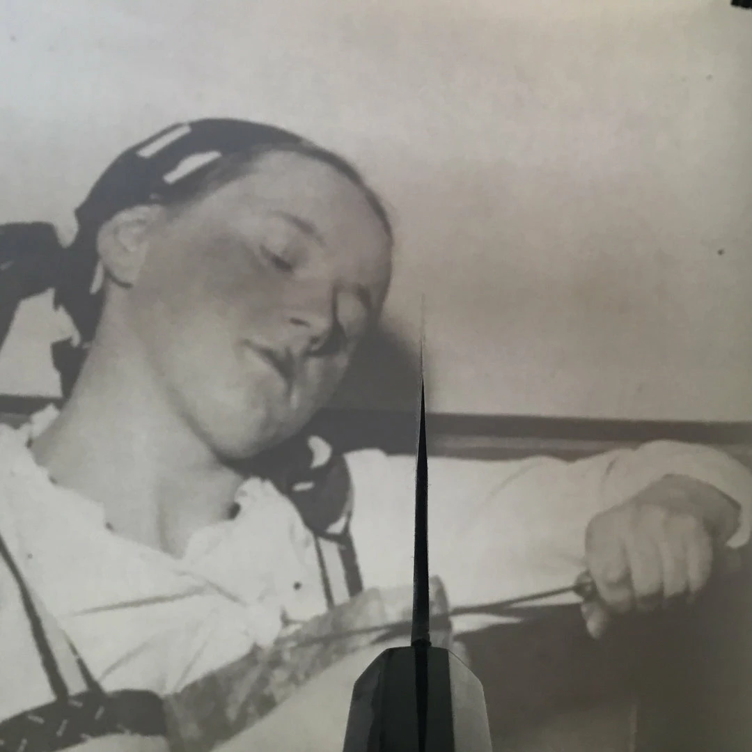 Hand forged iron clad shirogami 1 with kurouchi finish from the forge. Forged and ground thin for smooth cutting and easy sharpening but with a stiff substantial feel and generous height and a full belly.