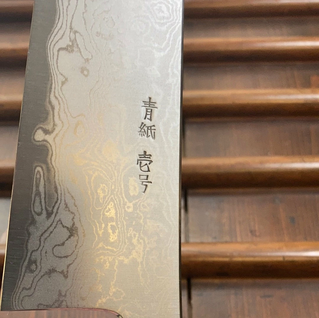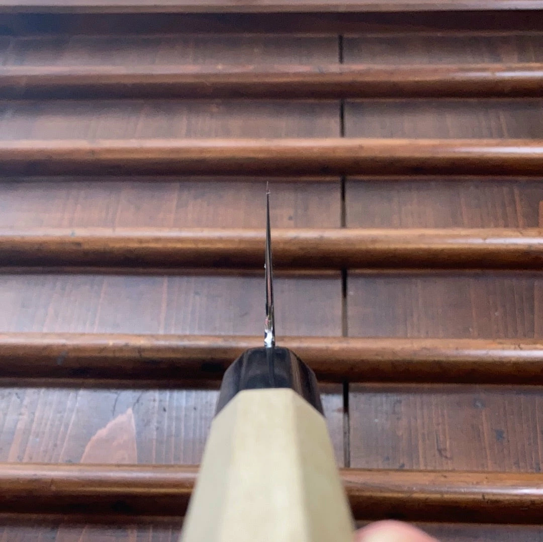 Sakai Kikumori โSoriโย 225mmย Kiritsuke Gyuto. Double bevel aogami #1 core bladeย iron and mild steel suminagashi cladding. Octagon magnolia wood and water buffalo ferrule handle.ย Made from Bernal Cutlery specifications and idea for aย sori (โbentโ or curved) spine for added clearance and extra curve in the edge to keep the kiritsuke tip high off the board during a forward push cut.