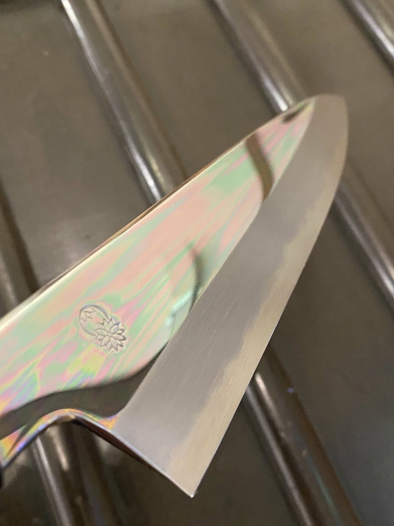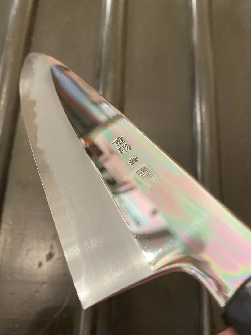Choyo grinder and polisher is Morihiro Hamono.ย Morihiro-san’s grinding is superb; he pioneered this type of low kiriba grind on wa-gyuto. The characteristic result of this grinding and polishing are the even, wide bevels, chamfered spine and brilliant mirror polish.
