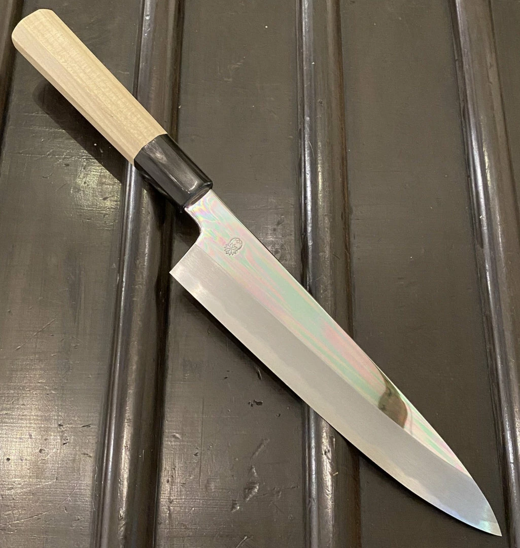 Sakai Kikumori โChoyoโ 210mm gyuto. Double bevel aogami #1 core with mirror polish iron cladding. Octagonal magnolia wood and water buffalo ferrule handle. Comes with saya.
