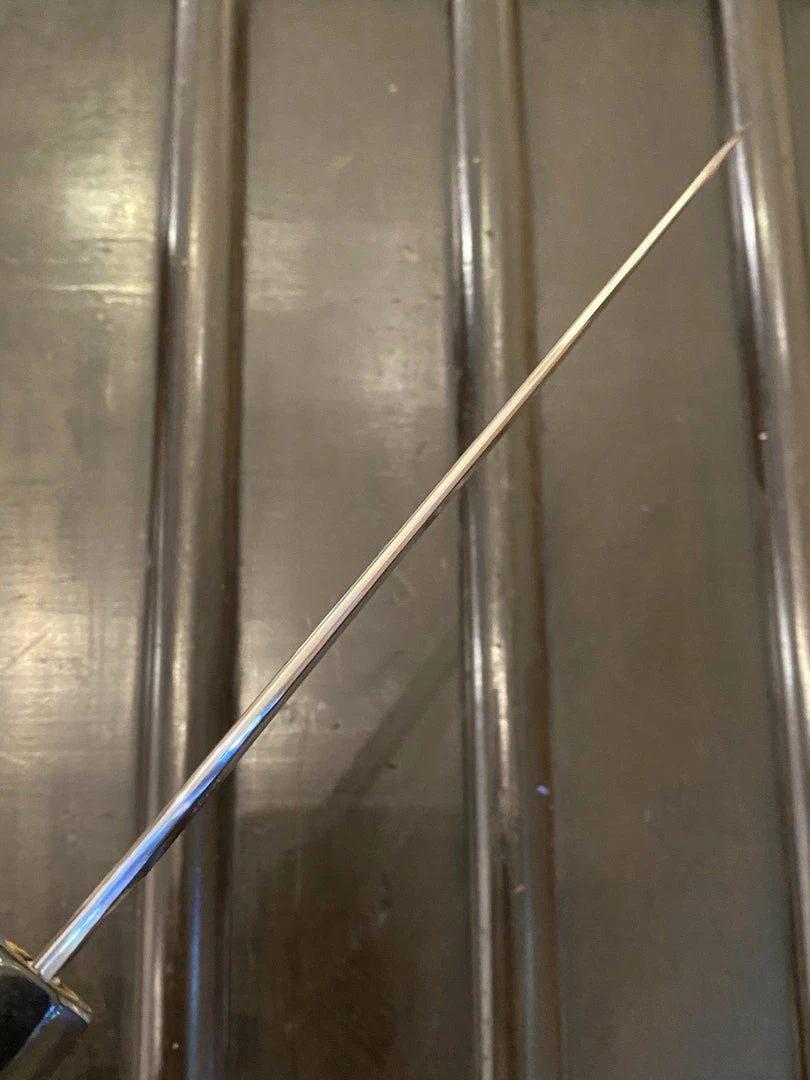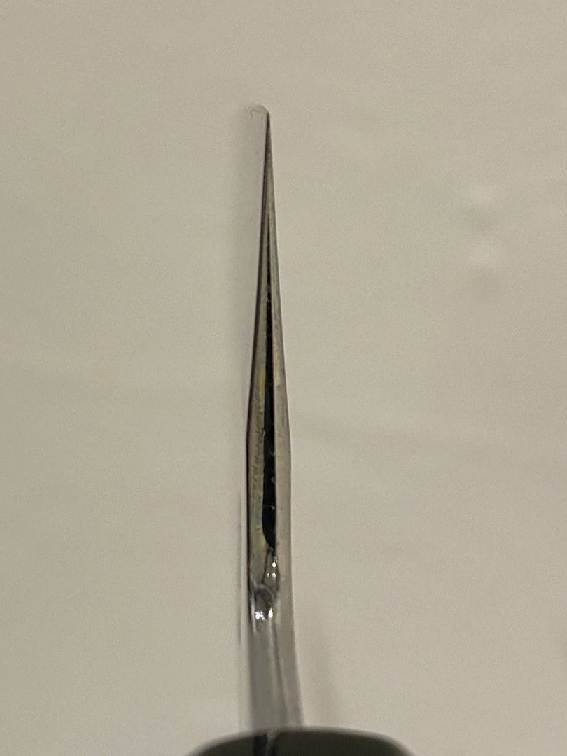 These knifes come from the maker with lacquer on the blade for corrosion protection during shipping. It can be removed using acetone or lacquer thinner (follow manufacturers instructions for use).