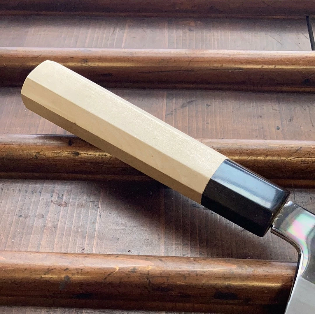 Choyo grinder and polisher is Morihiro Hamono. Morihiro-san’s grinding is superb; he pioneered this type of low kiriba grind on wa-gyuto. The characteristic result of this grinding and polishing are the even, wide bevels, chamfered spine and brilliant mirror polish.