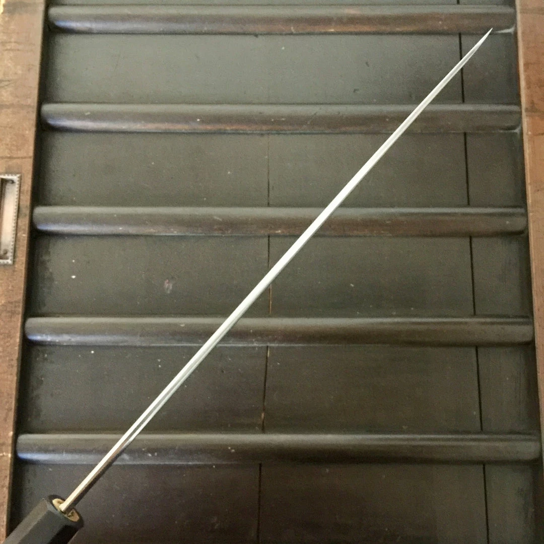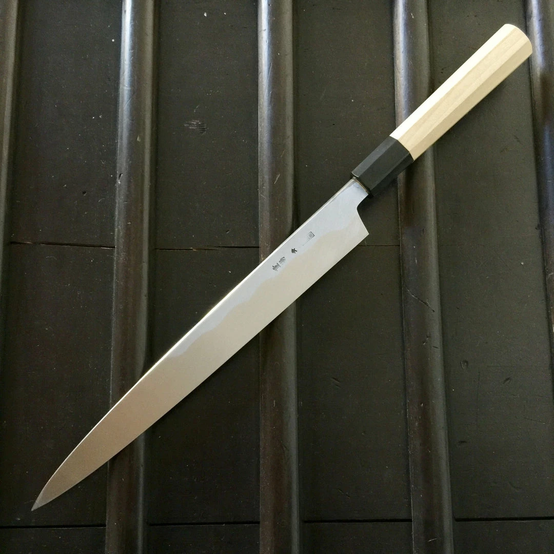 Sakai Kikumori โChoyoโ 270mm Yanagi. Single bevel aogami #1 core blade with mirror polish iron cladding. Octagonal magnolia wood and water buffalo ferrule handle. Comes with saya.