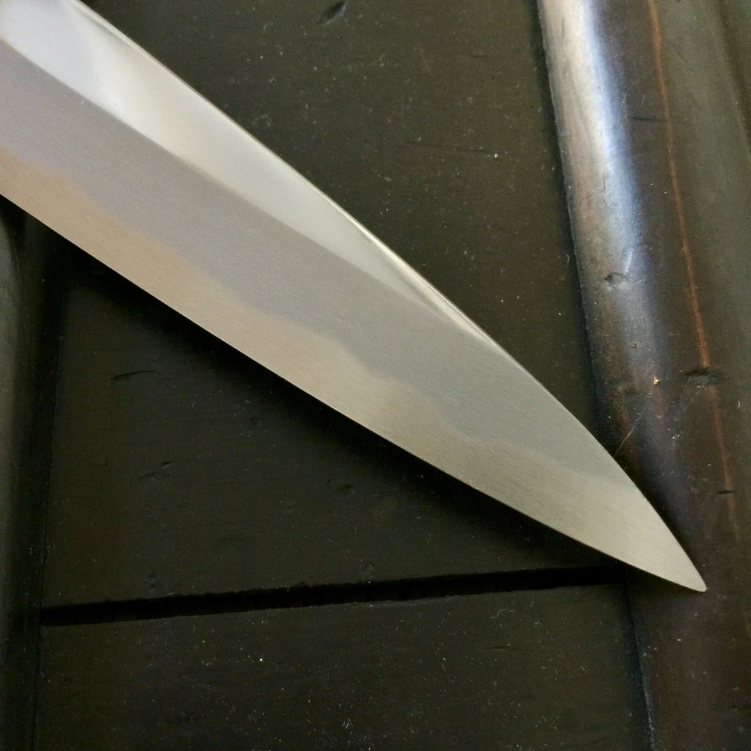 Choyo grinder and polisher is Morihiro Hamono.ย Morihiro-san’s grinding is superb; he pioneered this type of low kiriba grind on wa-gyuto. The characteristic result of this grinding and polishing are the even, wide bevels, chamfered spine and brilliant mirror polish.