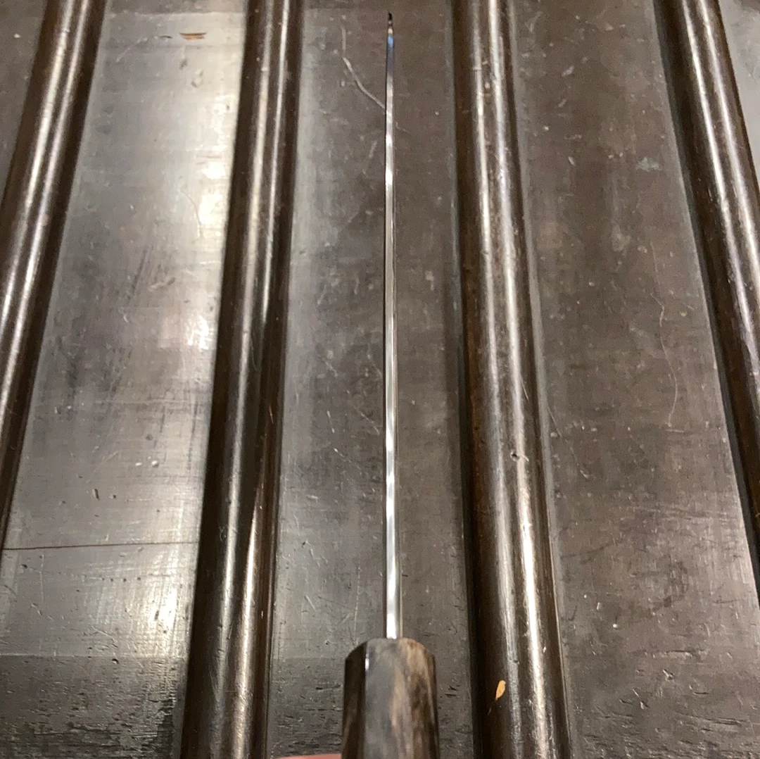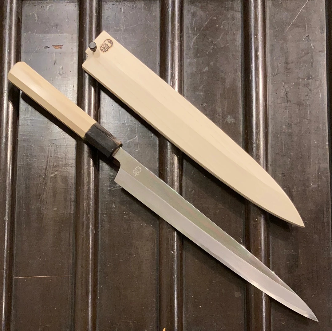 Sakai Kikumori โChoyoโ 270mm Yanagi. Single bevel shirogami #2 core with mirror polish iron cladding. Octagonal magnolia wood and water buffalo ferrule handle. Comes with saya.ย