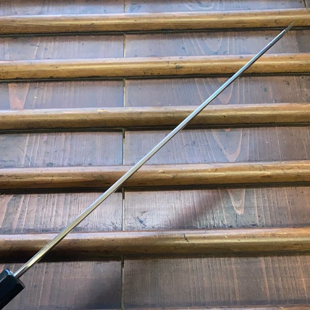 Sakai Kikumori ‘Kikuzuki Kasumi’ 300mm Kiritsuke Yanagi. Single bevel shirogami #2 core blade with iron cladding. Octagonal magnolia wood and water buffalo ferrule handle. Comes with saya.