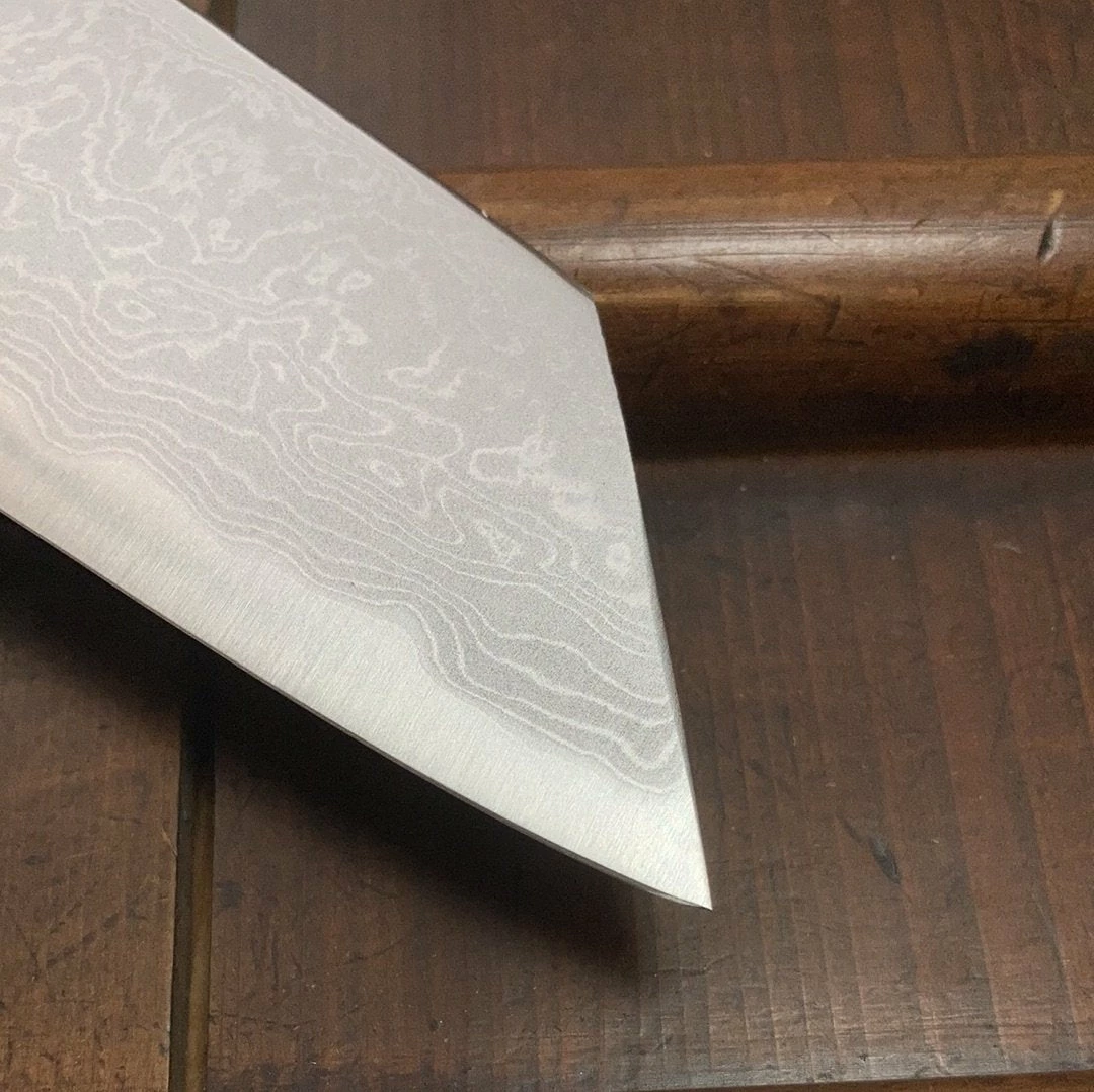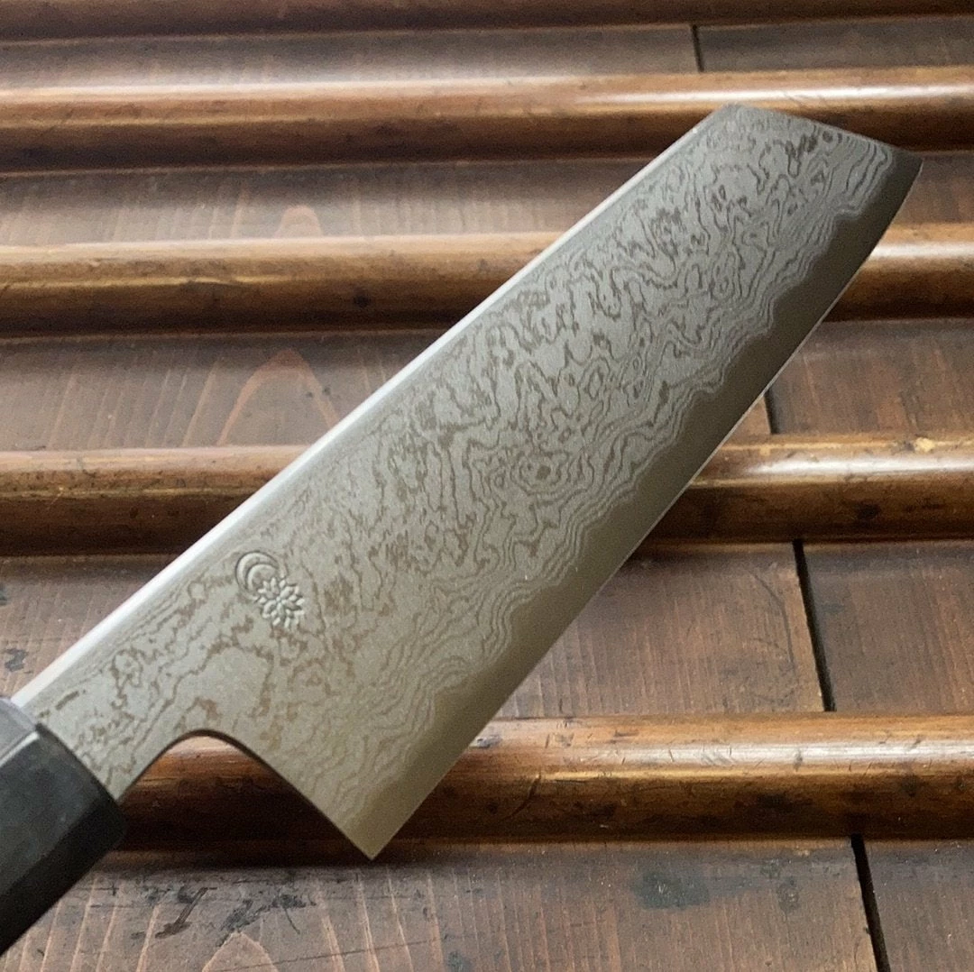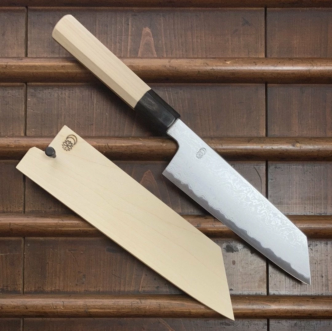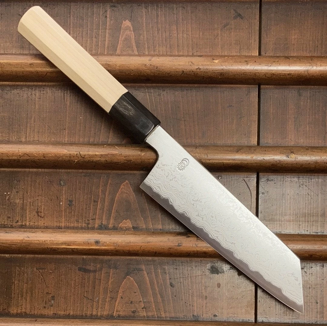 Sakai Kikumori ‘Kikuzuki Uzuโ 180mm Kiritsuke Santoku. Double bevel aogami #1 core blade with suminigashi iron cladding.ย Octagonal magnolia wood and water buffalo ferrule handle. Comes with saya.