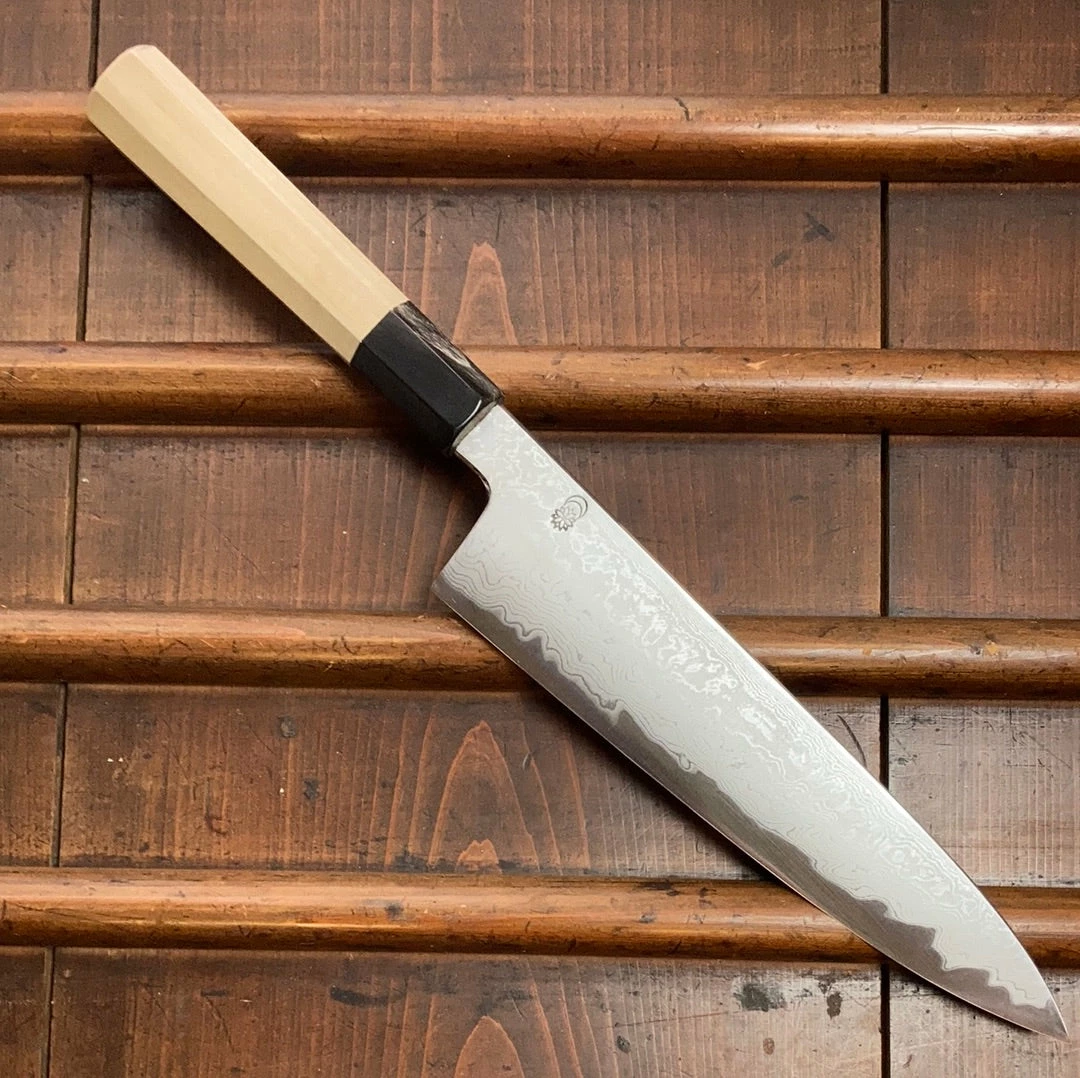 Sakai Kikumori Kikuzuki Uzu’ 210mm Gyuto. Double bevel aogami #1 core blade with damascus iron cladding. Octagonal magnolia wood and water buffalo ferrule handle. Comes with saya.