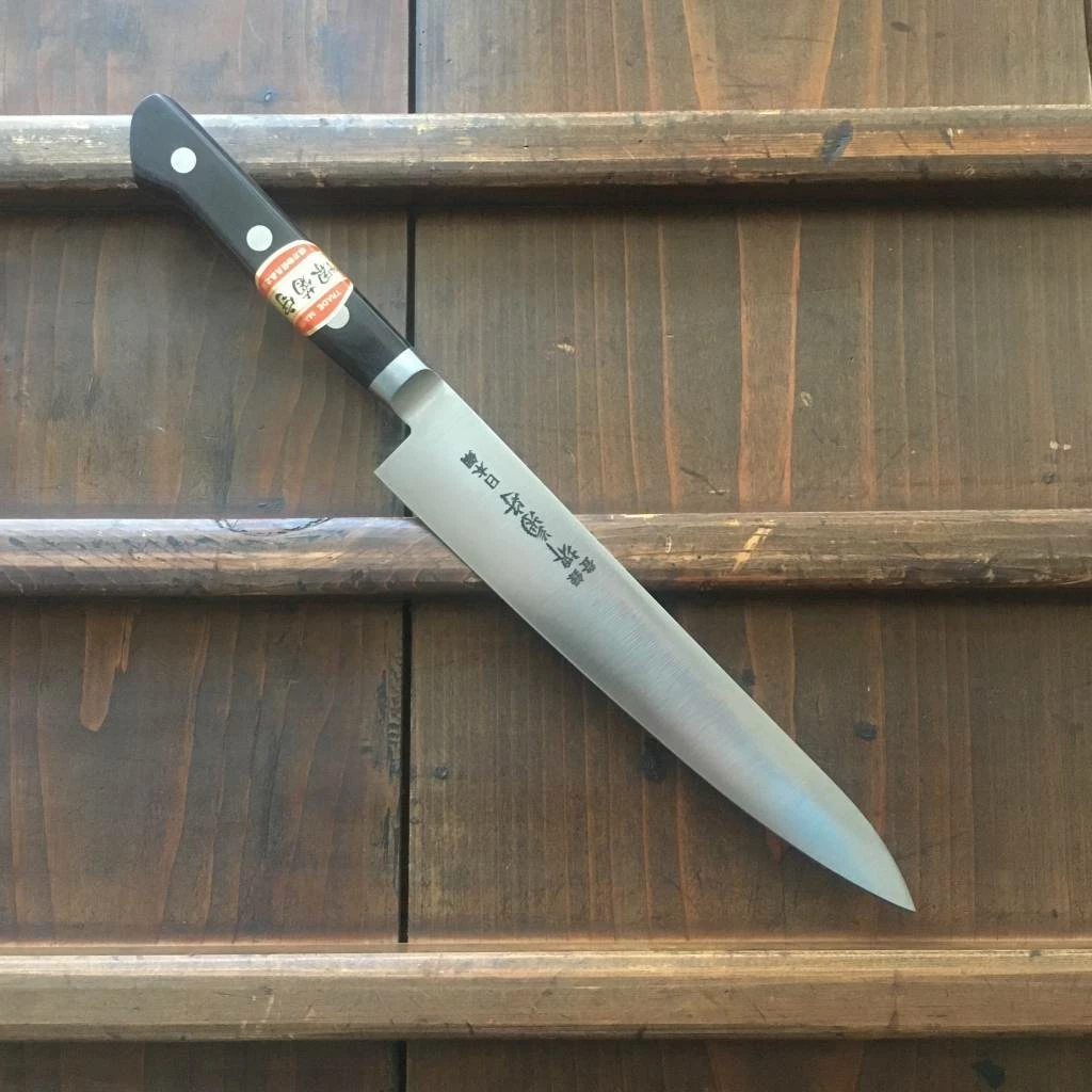 Sakai Kikumori’s Nihonkou line are reasonably priced factory made carbon steel knives with a carbon content of .95%, hardened to approx 63 HRC.