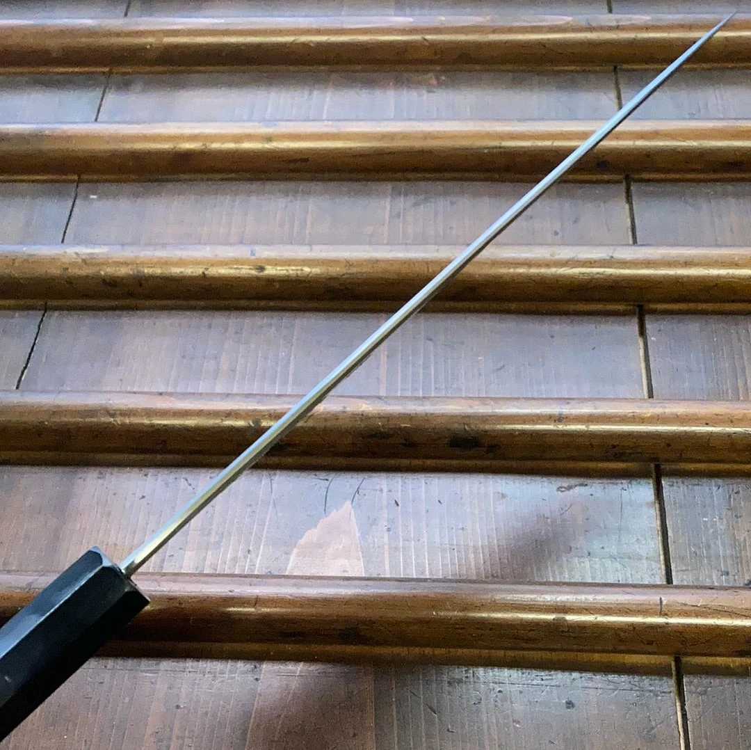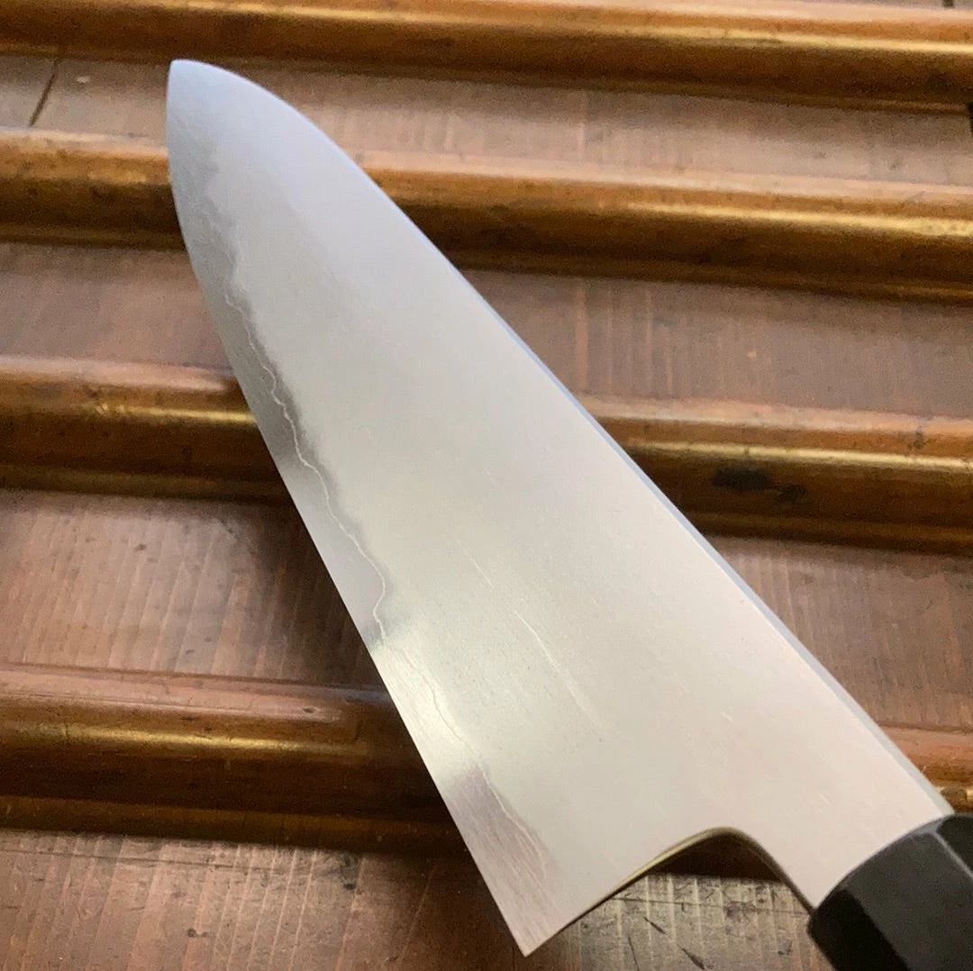 Sakai Kikumori ‘So-Ten’ย 210mm Gyuto in Aogami Super.ย ย Octagonal ebony wood and water buffalo ferrule handle. Comes with saya.