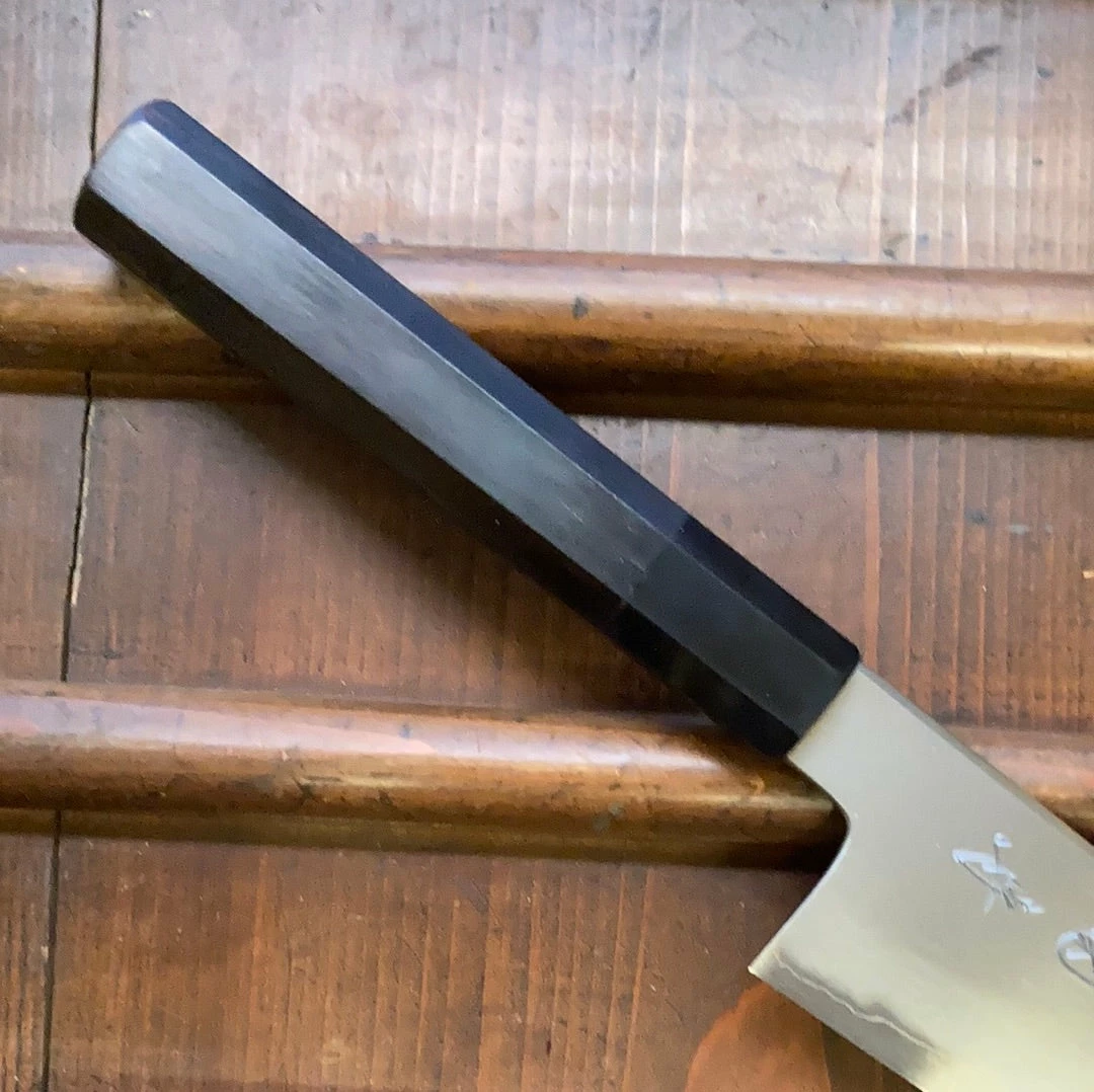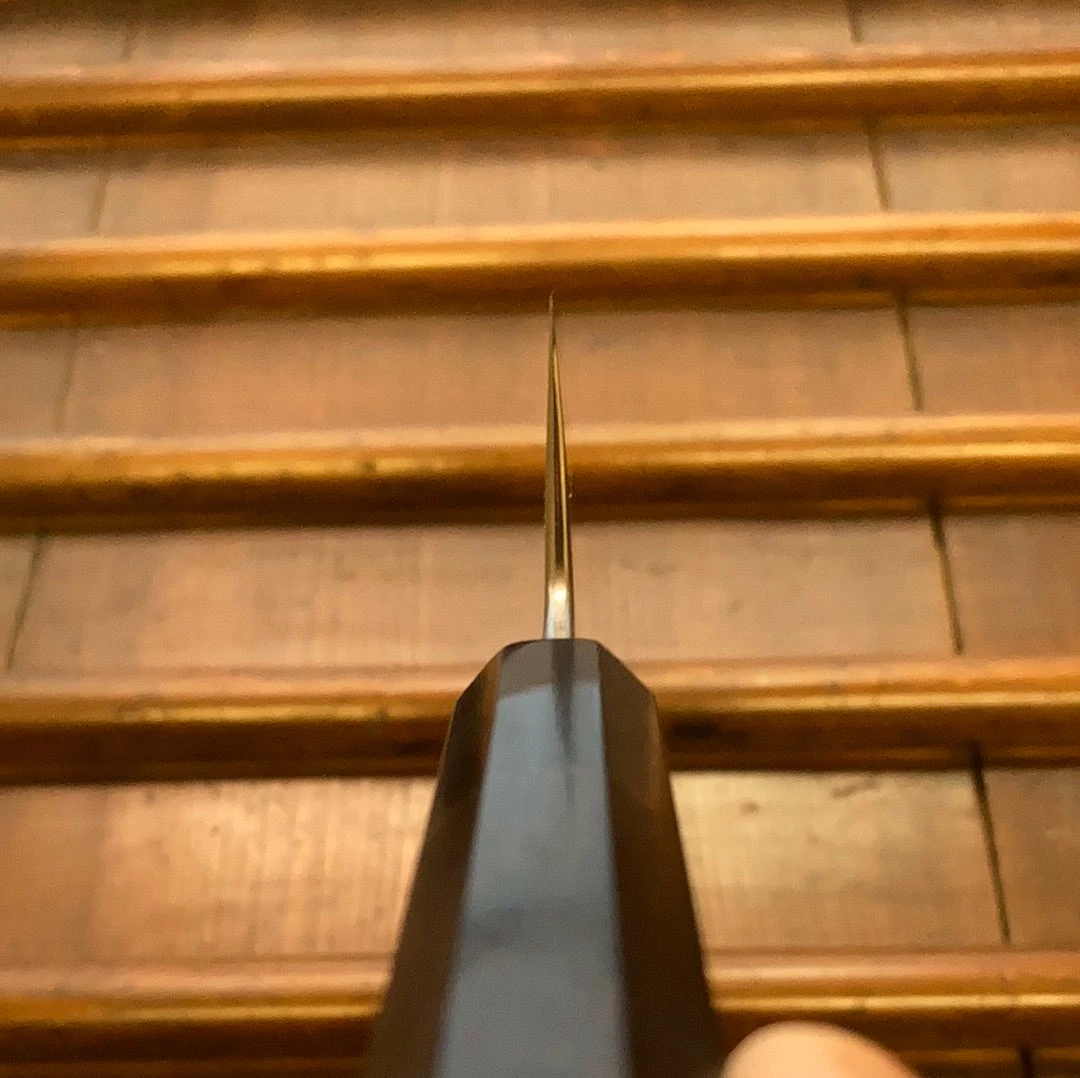 Aogami super knives usually hold an edge for a long time, but most donโt actually work well at a fine finish. Tanaka-sanโs temperature control during forging, combined with thorough heat treatments make for far better edge formation than the average aogami super.ย There is no glassy, hard feeling during cutting or on stones.