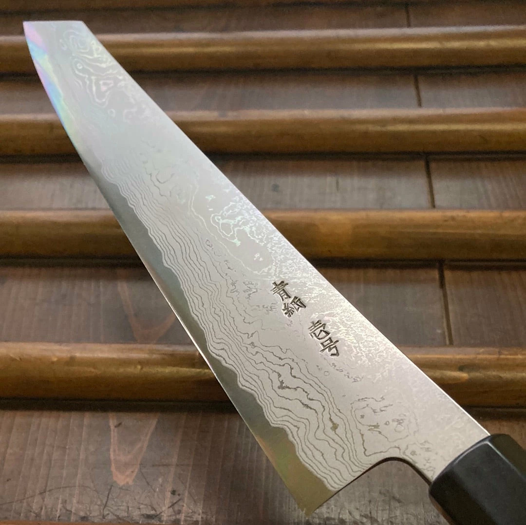 Sakai Kikumori ‘Sori’ 240mm Kiritsuke Sujihiki. Double bevel aogami #1 core blade iron and mild steel suminagashi cladding. Octagon magnolia wood and water buffalo ferrule handle with a sori “bent” or curved spine.