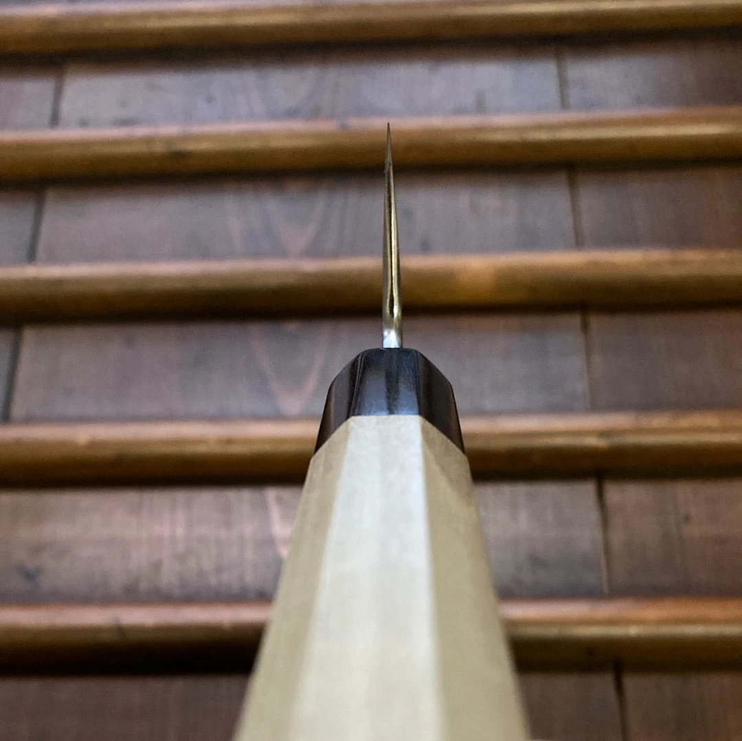 Sakai Kikumori ‘Sori’ 270mm Kiritsuke Sujihiki. Double bevel aogami #1 core bladeย iron and mild steel suminagashi cladding. Octagon magnolia wood and water buffalo ferrule handle with aย
