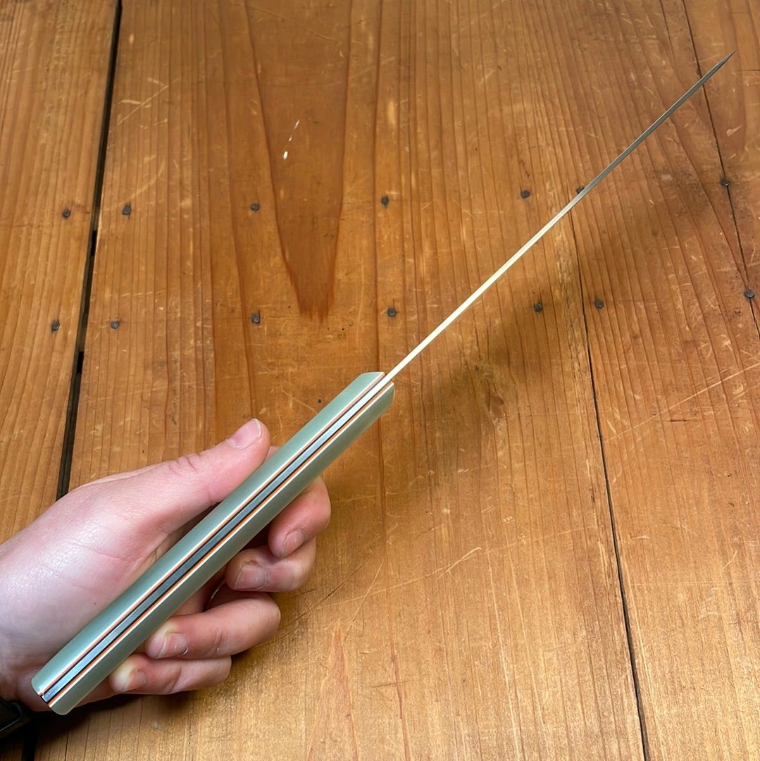 Handmade by Daniel Hilgenberg of Silverthorn Knife & Tool. The Silverthorn chef is a deep bellied chef with good amount of flat spot in the heel and a little bit of flat spot in the tip behind the kiritsuke style tip.ย