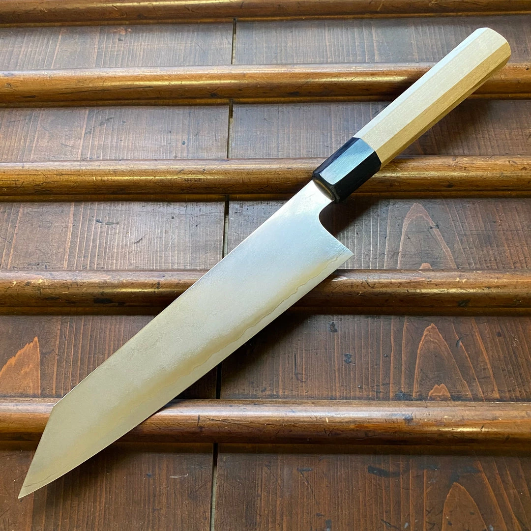 Hand made stainless clad ginsanko stainless steel made in Sakai Osaka Japan, forged at Shiraki Hamono by the super talented young smith Nakagawa-san and hand ground and finish sharpened at the Takada no Hamono workshop. This ginsanko offers excellent edge life and can be finished similar to fine carbon steels like shirogami.ย