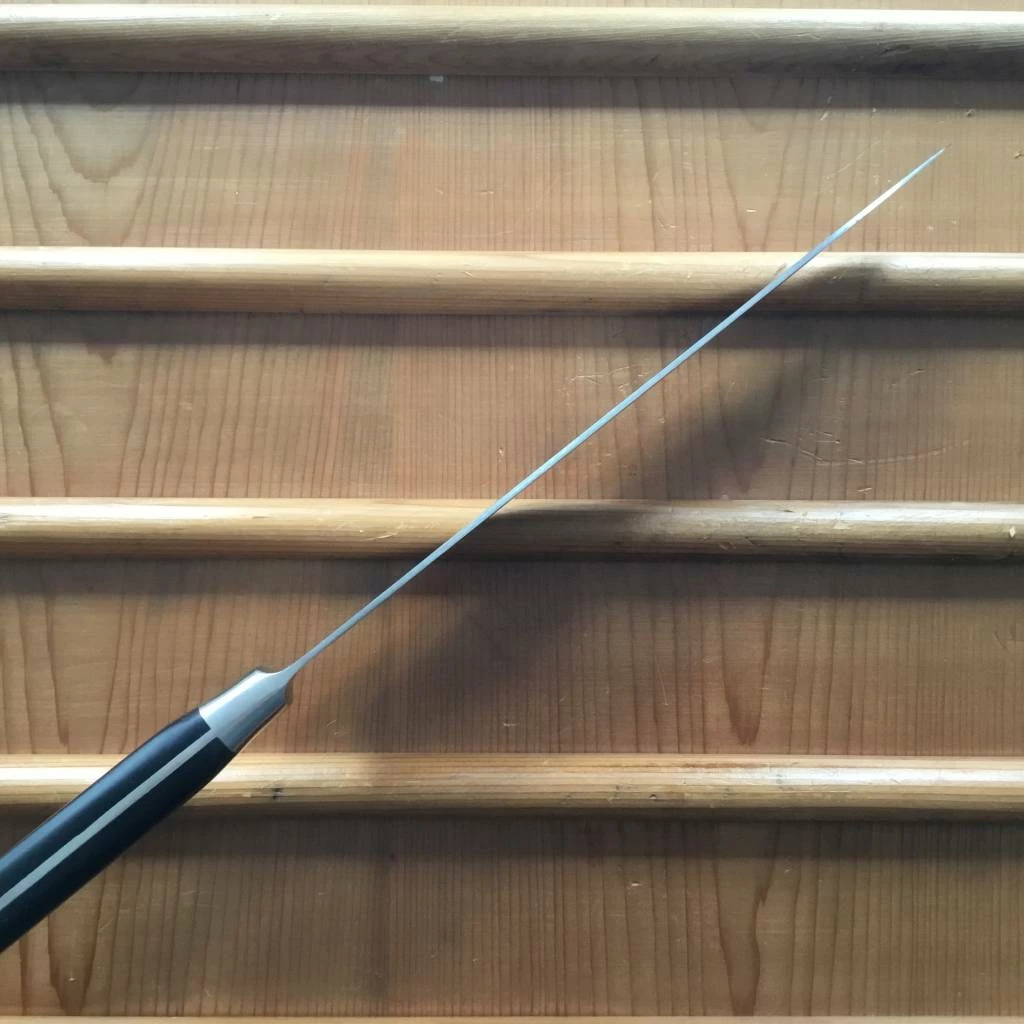 Tojiro’s R2 knives are super thin behind the edge, and sport R-2 powder steel (also known as SG2) at the core hardened to 64 HRC; making for a long-lived cutting edge. The handles are made of black stamina wood; which is an extremely stable material fabricated with resin-impregnated wood veneers that have been compressed under high heat.