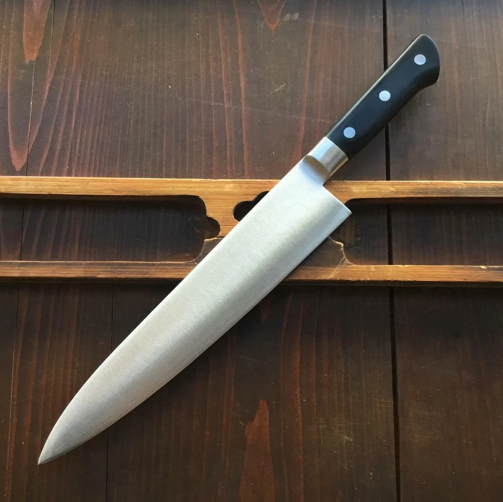 Tojiro 270mm R2 powder steel Gyuto knife with riveted western handle. HRC 64.