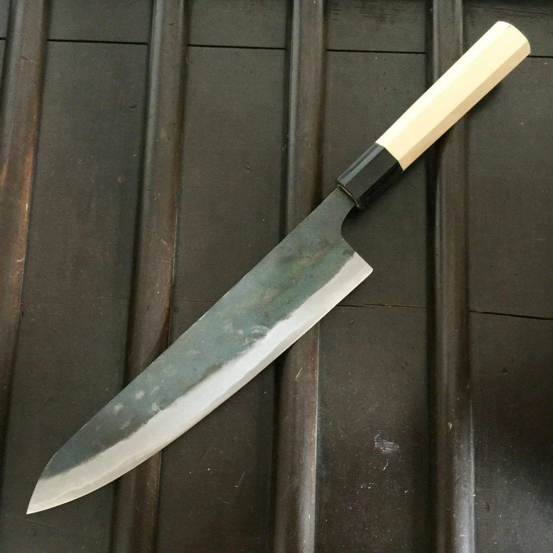Hand forged knives from the Tosa area of Shikoku Island, Japan’s least populated island with a long history of smithing. Shikoku’s thick forests, agriculture and fisheries have led to a local style of smithing that is characterized by rustic free forged knives and tools. Many Tosa knives are ryoba style; forged and ground symmetrically and are suitable for both right and left hand users.