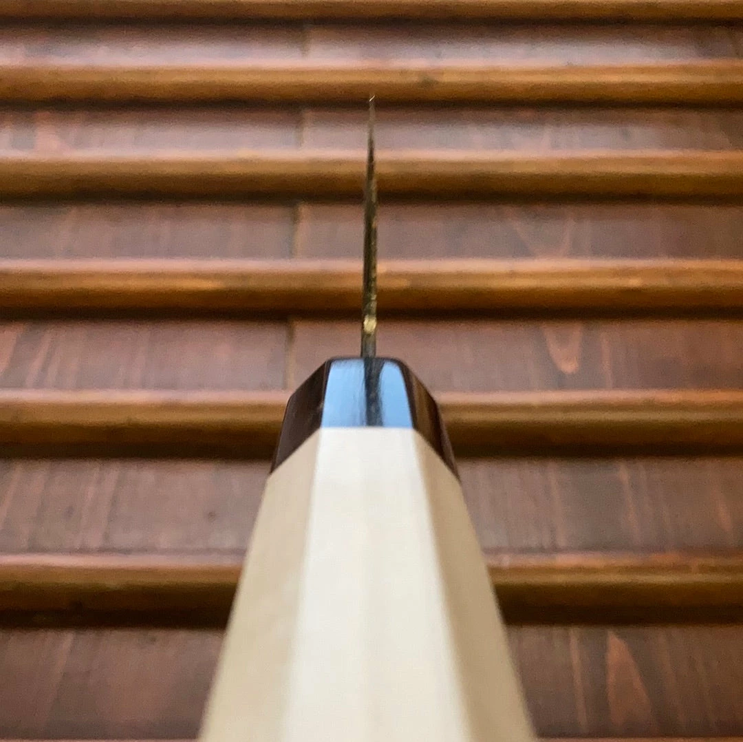 Stainless clad aogami 1 gyuto forged by Tosa Tadayoshi to Bernal Cutlery specifications. This work horse hand forged gyuto is designed especially with a forward rocking push cut in mind for a mix of vegetable and boneless protein work. These have enough height at the heel to work well for those with larger hands but not so tall as to sacrifice control. The tip is designed to be in line with the inside of the handle to provide enough belly for a rocking push cut but also to provide good control for fine work at the tip and a bit of flat spot at the heel to provide fast contact.