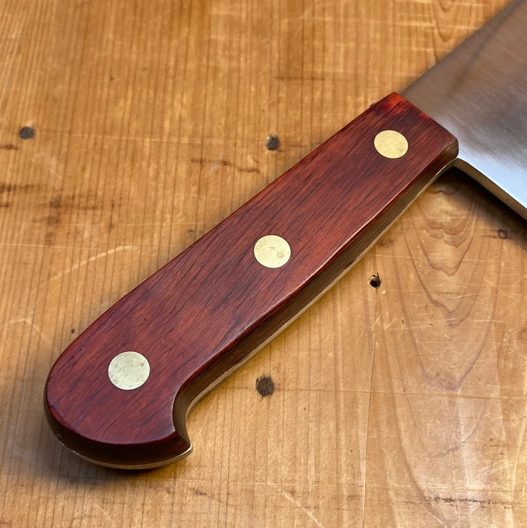 K Sabatier ‘Auvergne’ series 6″ meat cleaver. Forged stainless steel with red pakka wood handle and brass rivets.