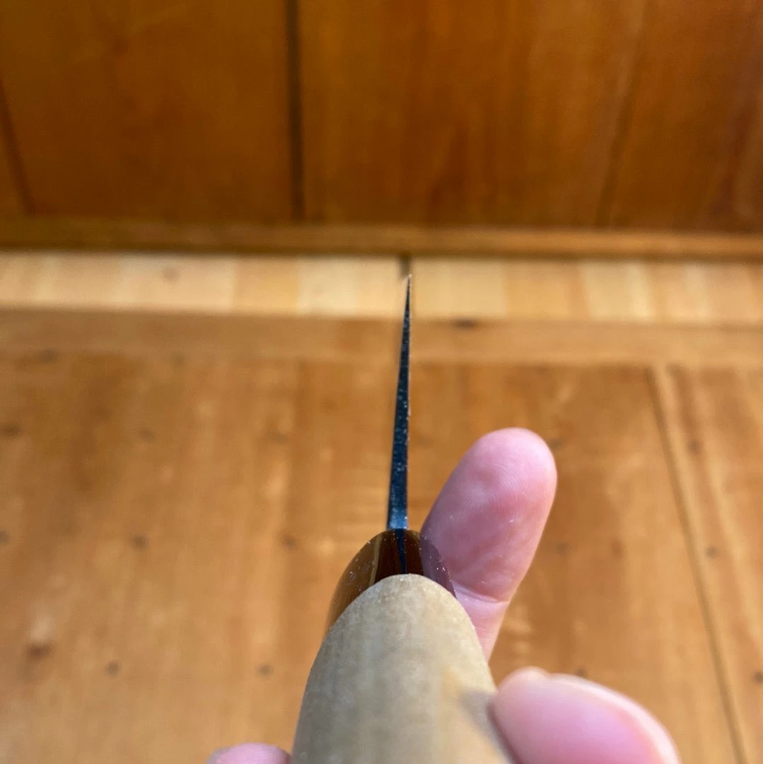 Trade in forged carbon steel nakiri in good condition with original packaging and saya. Arrived with light surface corrosion on keriba bevel that was removed with natural stone grit to preserve kasumi finish. Fresh edge and still thin. Unavailable from original retailer.