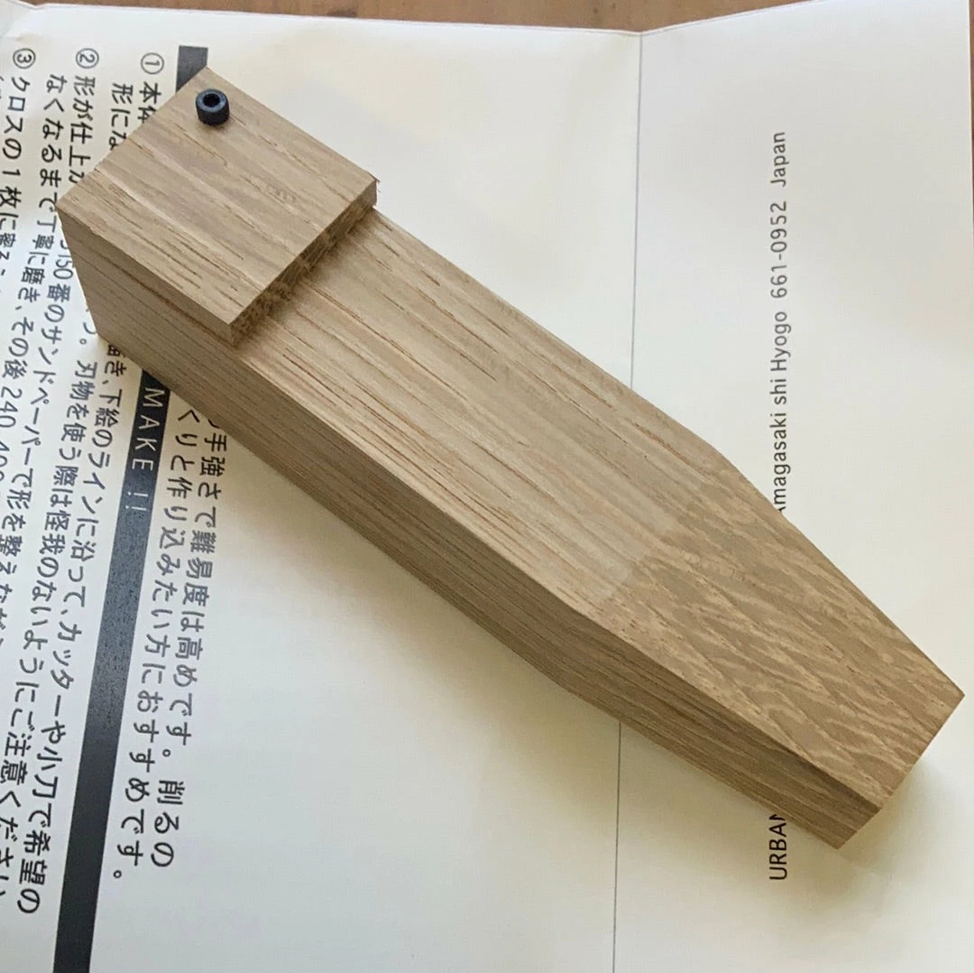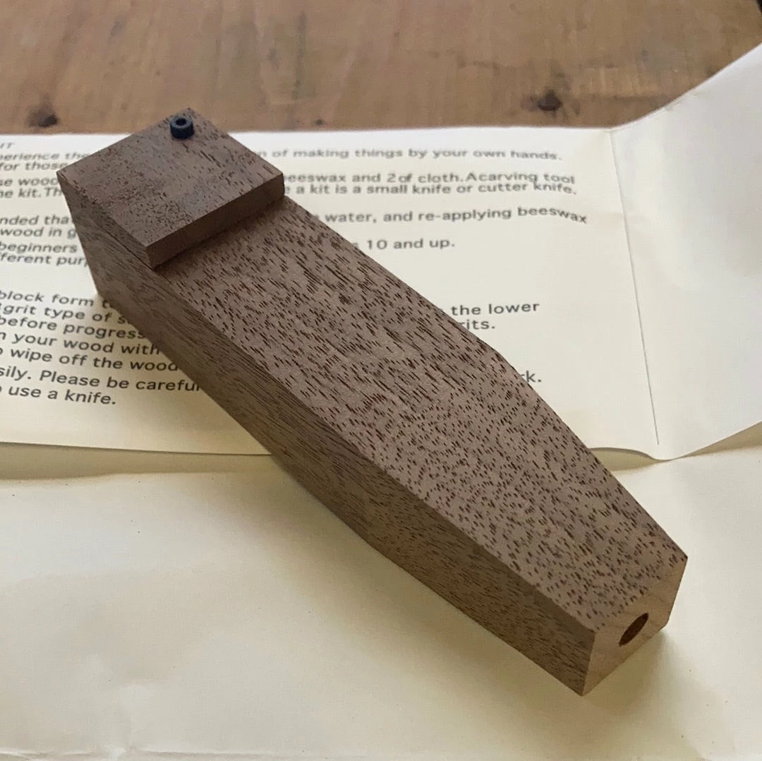 ‘My Pipe’ DIY carving kit. Includes pre-cut shape, 3 grits of sandpaper, and beeswax for finishing. Carving knife NOT included. Made in Japan.