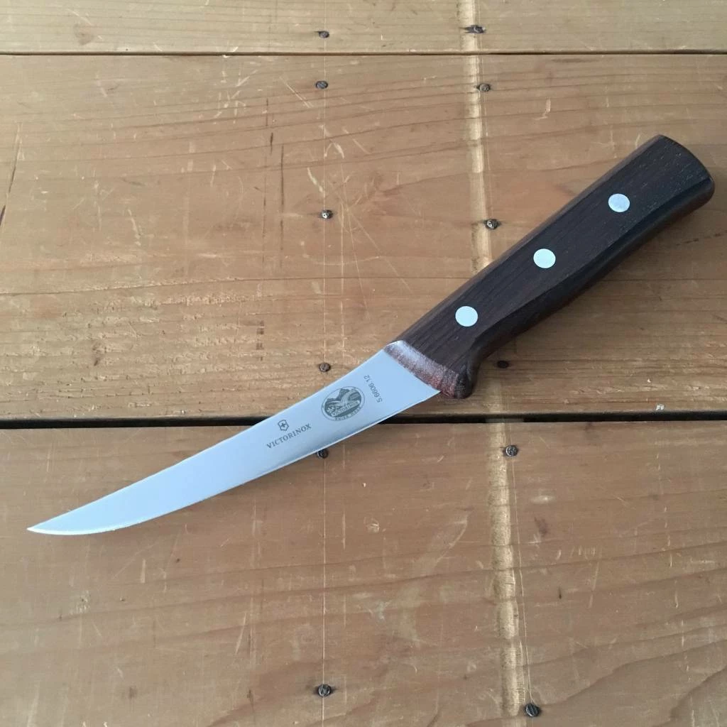 Victorinox 5″ curved boning knife with stiff blade. Stainless steel with a wood handle.