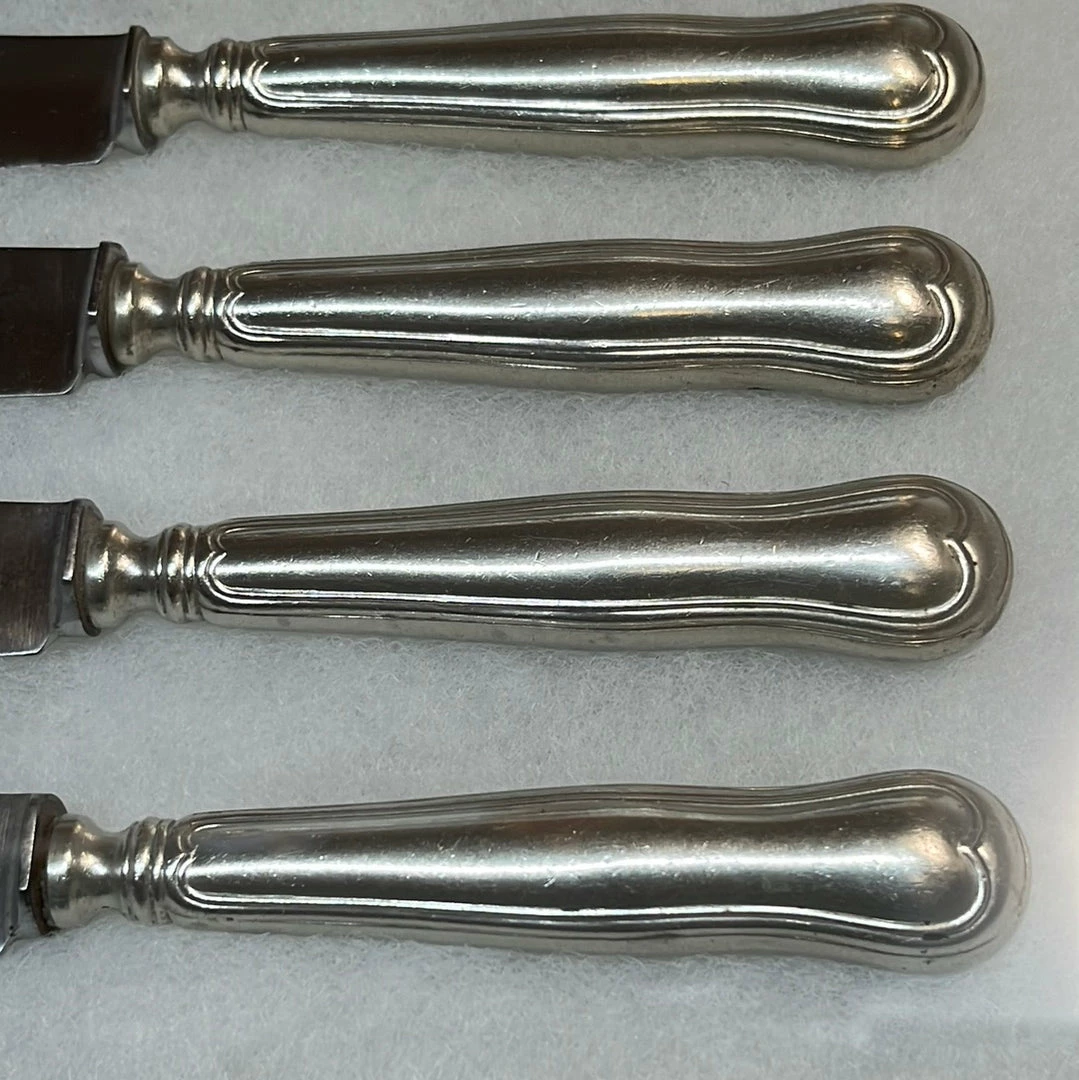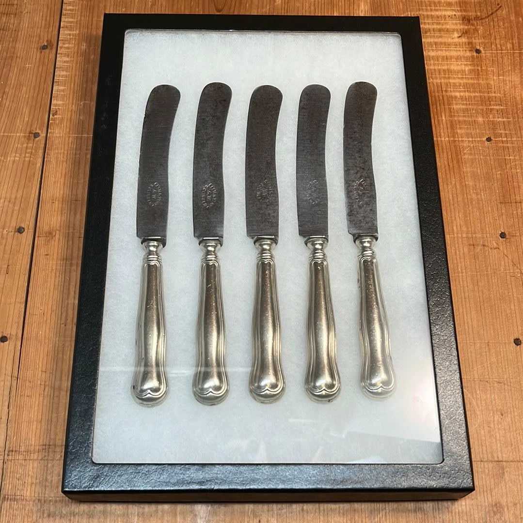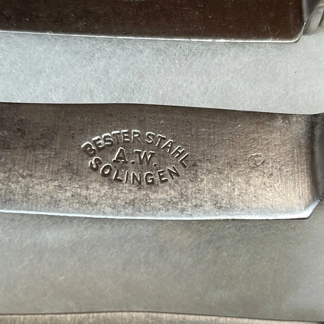 Antique ‘Bester Stahl A.W. Solingen’ Buckels pattern table knives made from approx 1900-1920 in 8x12x3/4″ Riker display box.