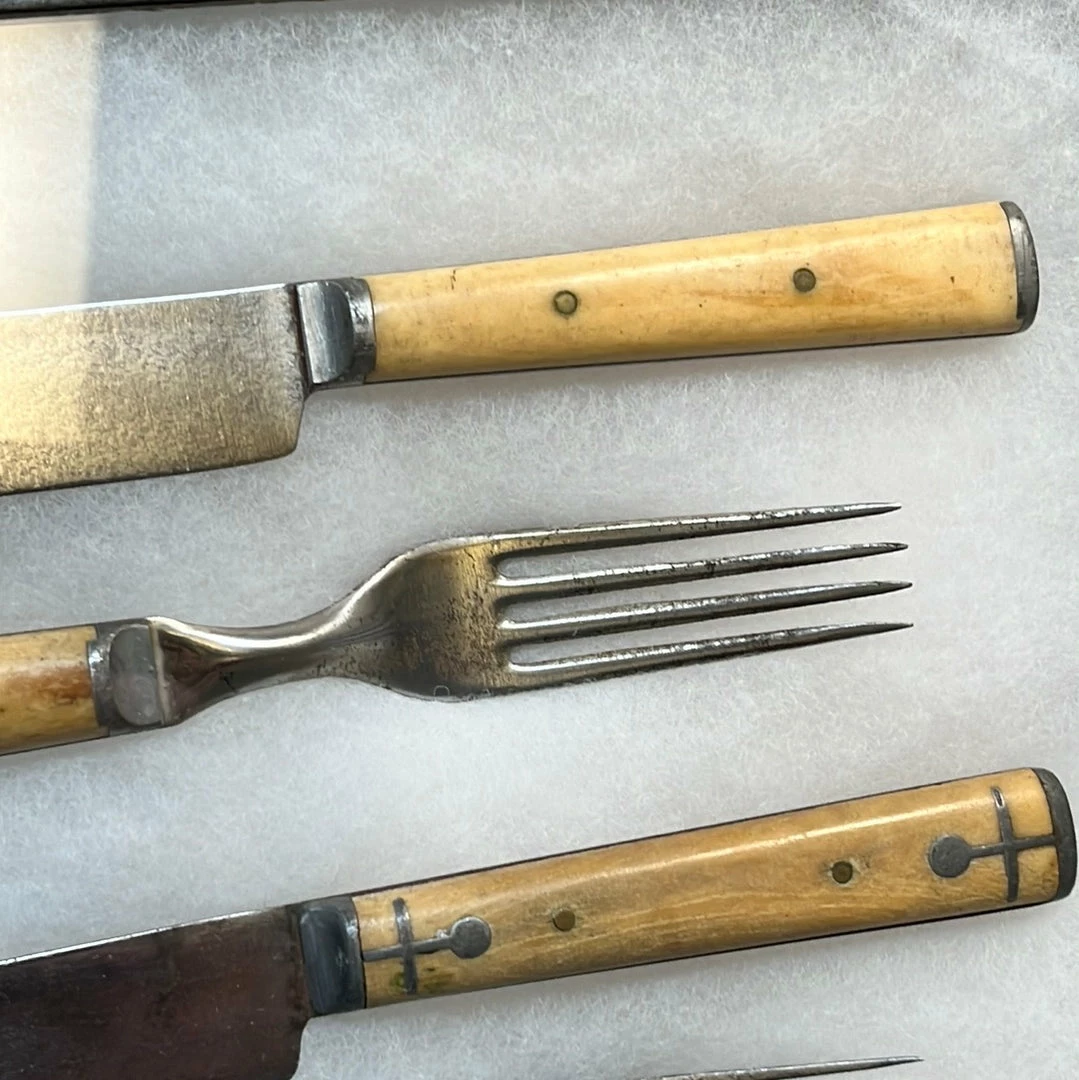 Antique LF&C table knife and forks with quintessentially American cast pewter and cowbone bolsters, handles and buttcaps, older set with decorative inlay in 8x12x3/4″ Riker display box.