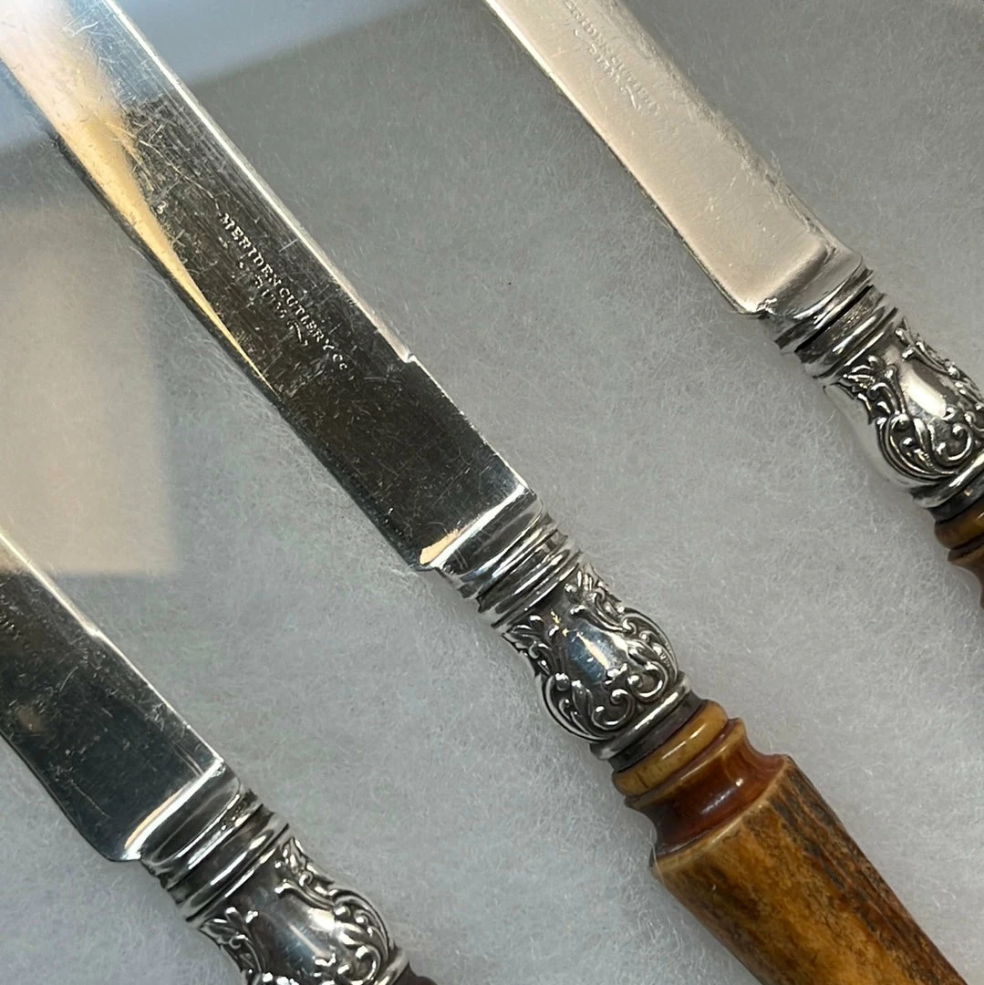 Antique Meridan Cutlery Co dessert knives with silver plated steel blades, Sterling silver ferrules and turned stag tip handles in 8x12x3/4″ Riker display box.