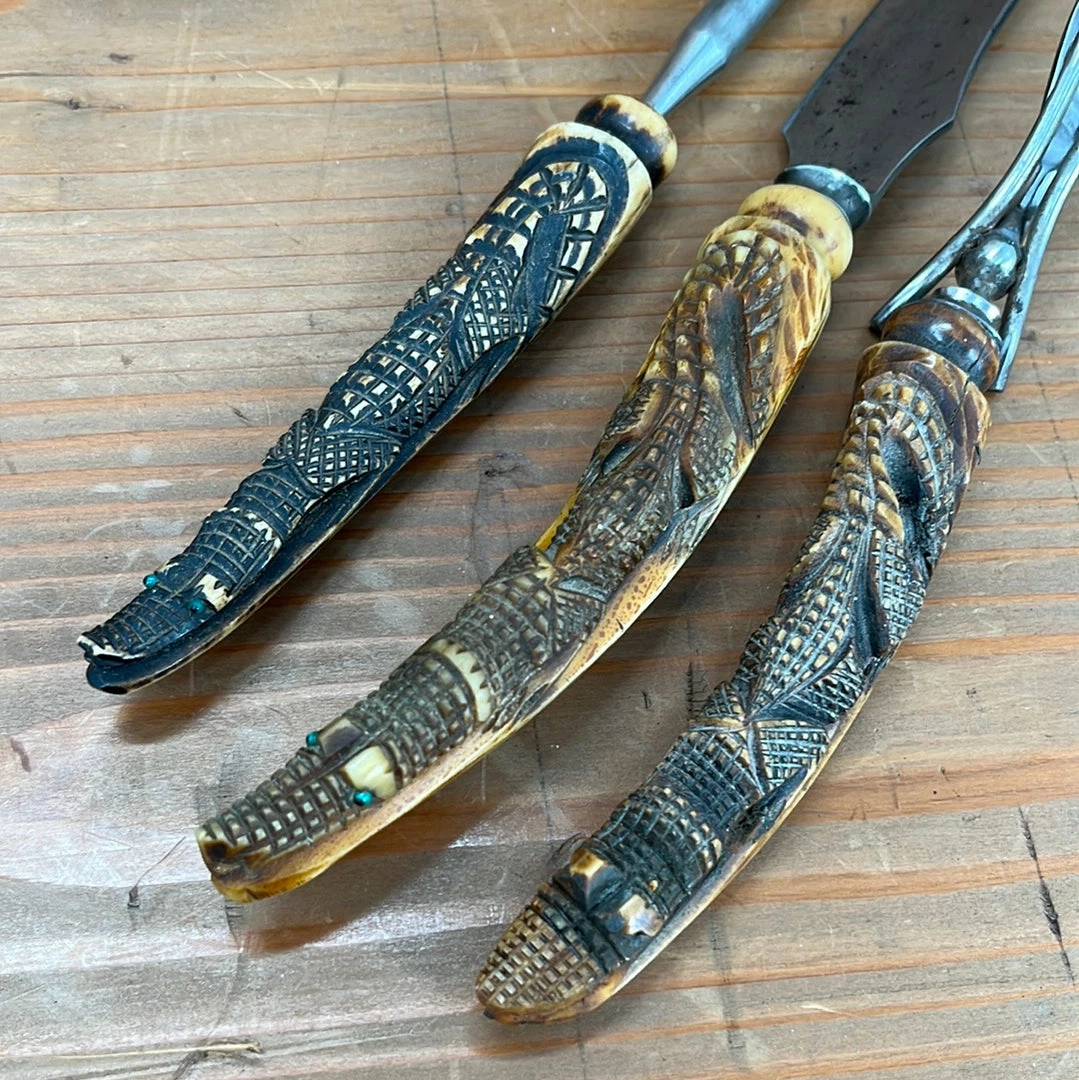 Made for the Hibbard Spencer & Bartlett Company (later to become True Value Hardware) by the J Russell company from approx 1880’s to 1900. The J Russell company made a carving set with a distinctive carved stag handle in the form of an alligator with green and black glass eyes.ย