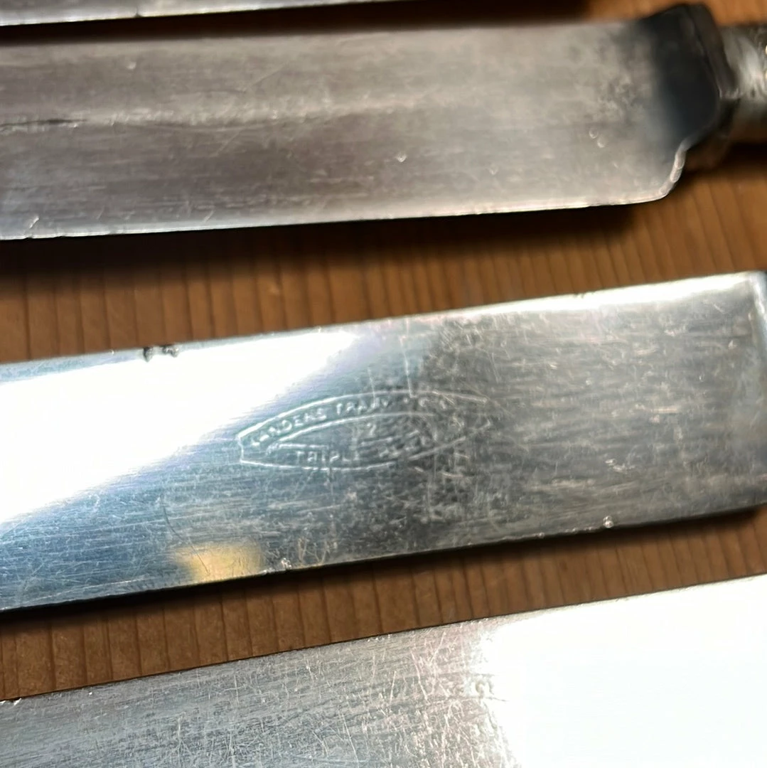 Most of the ‘triple plate’ silverplate on the blades is intact, there is some wear and loss from rust in some, 7 of the 12 have been soldered back together at some point, the solder is visible but not too terribly distracting.