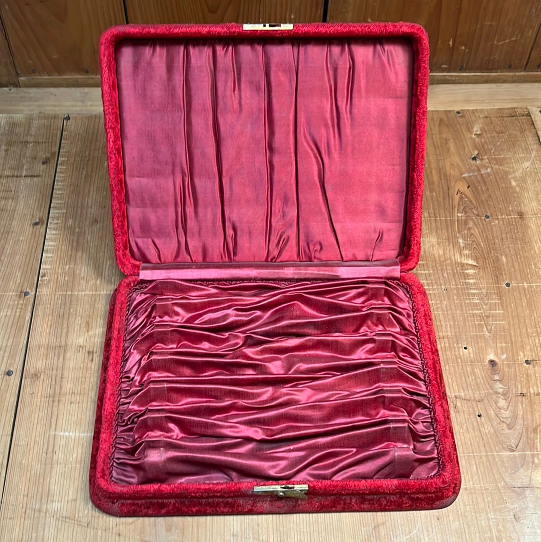 Landers Frary & Clark set of 12 luncheon knives in very red, ultra luxe box. Knives are forged silverplated carbon steel with unusual knurled pattern silverplated ferrules with mother of pearl handles.