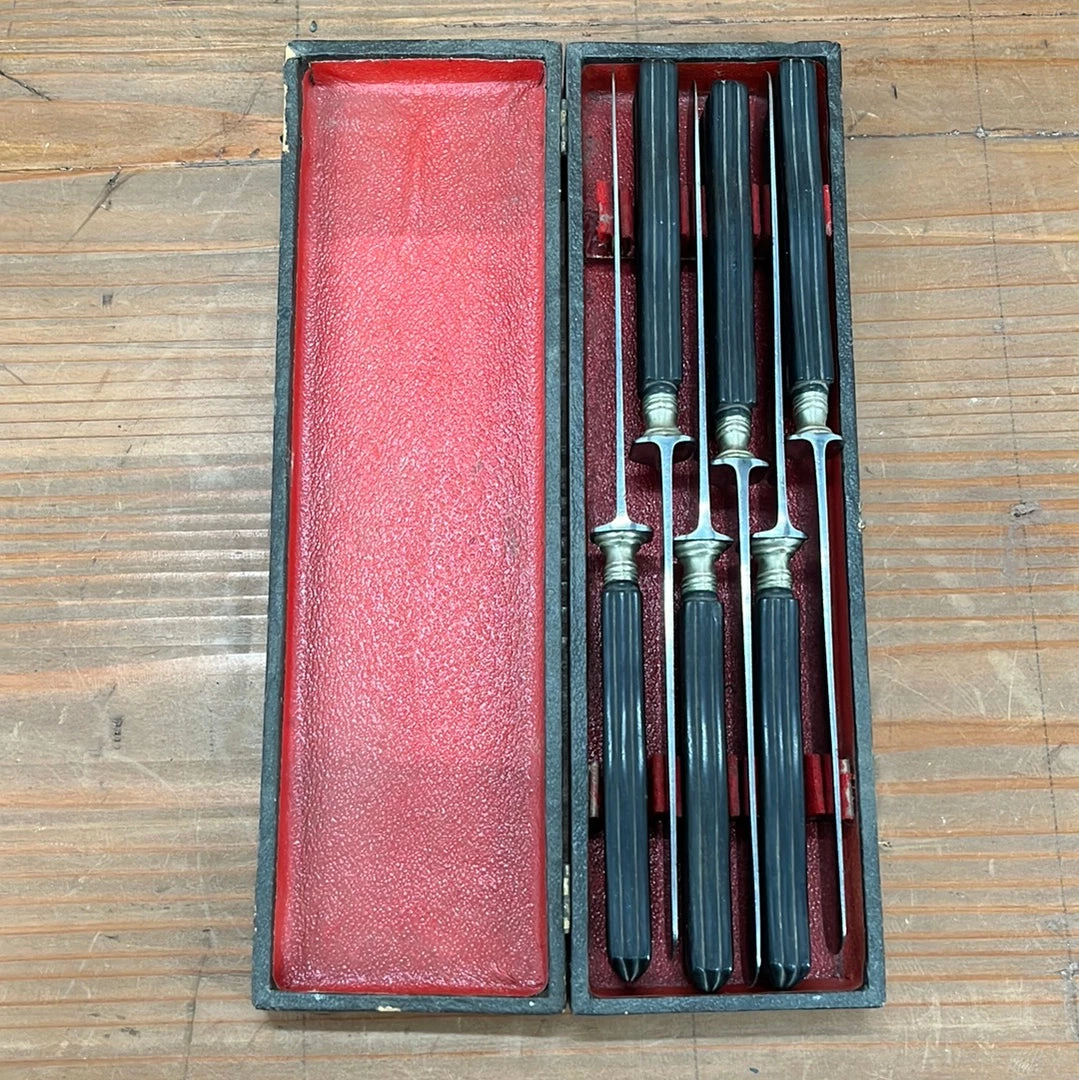 Forged and hand ground carbon steel table knives marked simply ‘Acier Fondu Garanti’ – Cast Steel Guarantee with nickle ferrules and carved ebony handles. With original box.
