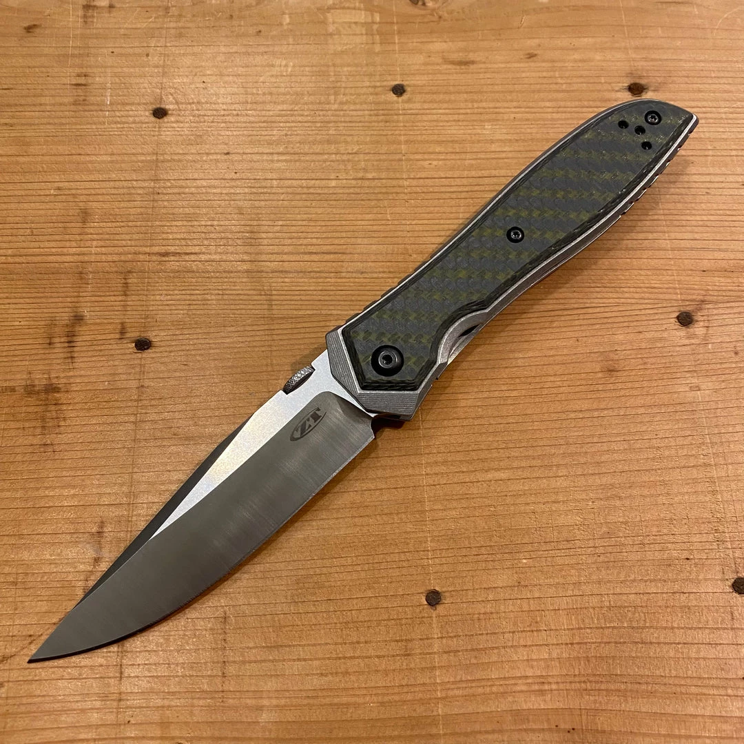 No KVT. No flipper. All function. The 0640 is a ZT and Ernest Emerson collaboration built for practicality and eye-catching style. The clip point blade is CPM 20CV high-chromium stainless steel for a wicked, long-lasting edge. The handle is titanium with a green-and-black carbon fiber overlay on both sides of the handle. This fully manual knife opens one-handed with a thumb disk.
